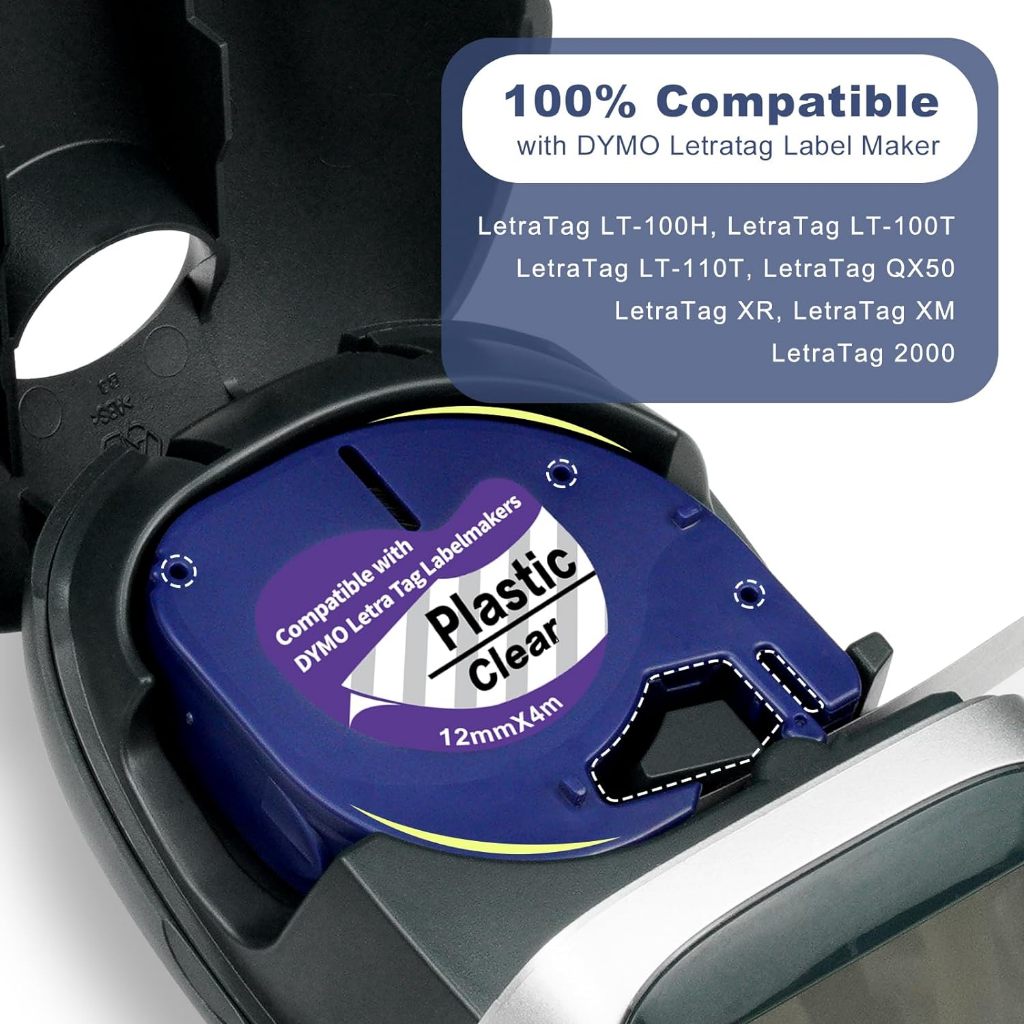 DYMO Compatible Label Tape LetraTag Refills 12267 16952 Plastic LT Labeling 3-Pack, for DYMO Letra Tag Plus LT100H LT100T LT200B Label Makers, Black Print on Clear 12mm x 4m