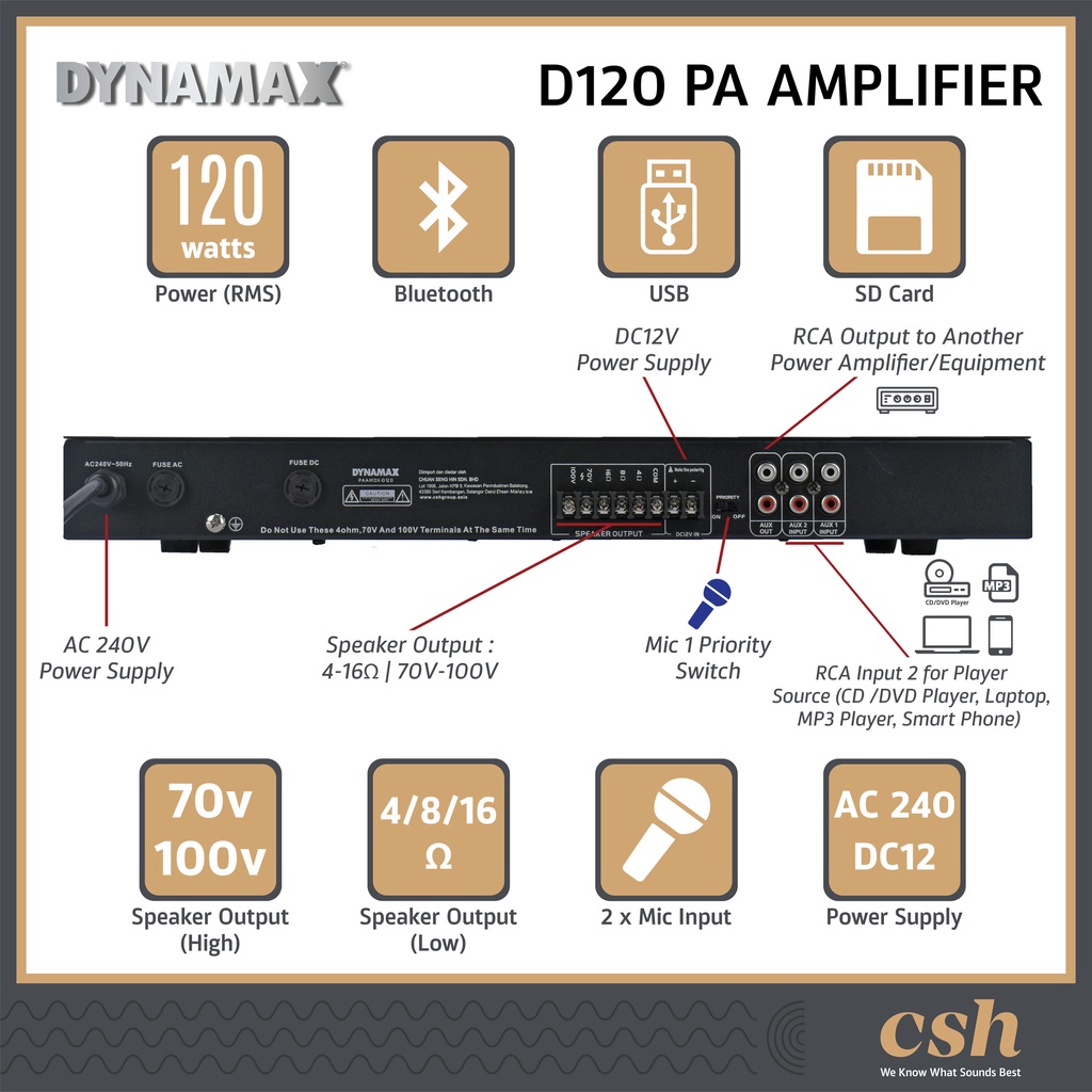 DYNAMAX D120 120W PA Amplifier, Public Address Amplifier, PA System With Bluetooth/USB for Surau, Office, Cafe, Park