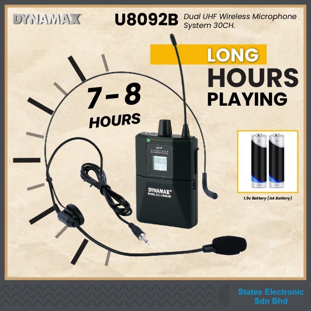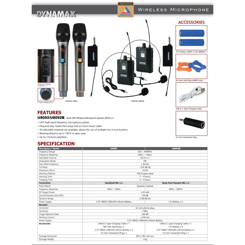 DYNAMAX U8092 Dual UHF Wireless Handheld Microphone or Bodypack Headset Microphone Rechargeable Receiver (Mikrofon x2)