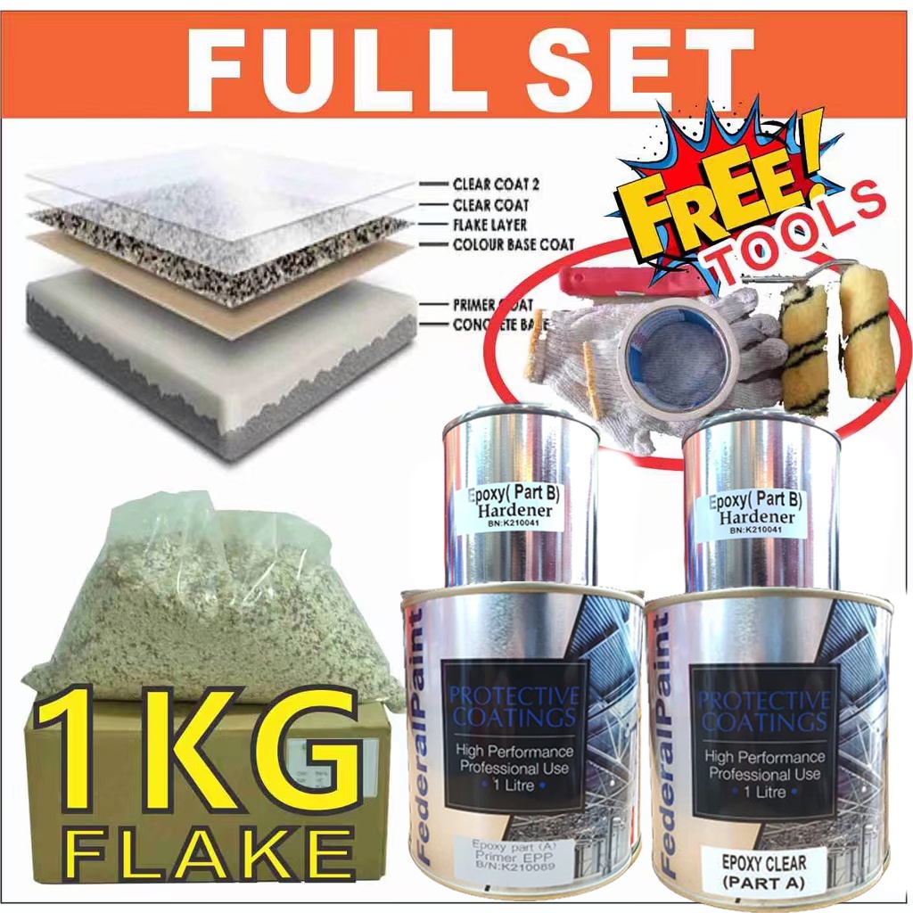 Dark Grey Mix Full Set Epoxy Flake Coating (1L Flake Primer/ 1L Flake Coating/ 1KG Flake/ Free Tools) Cat Lantai Floor