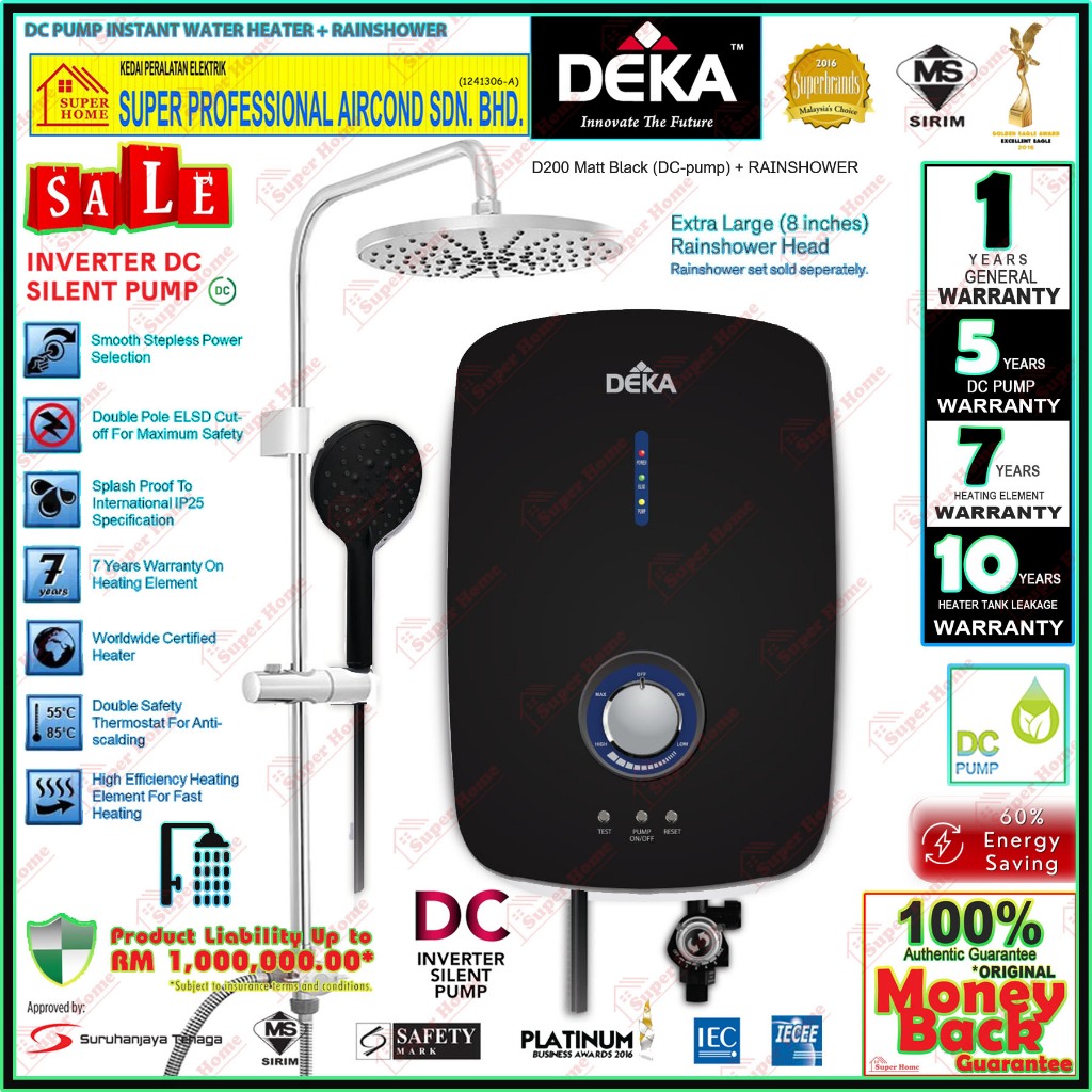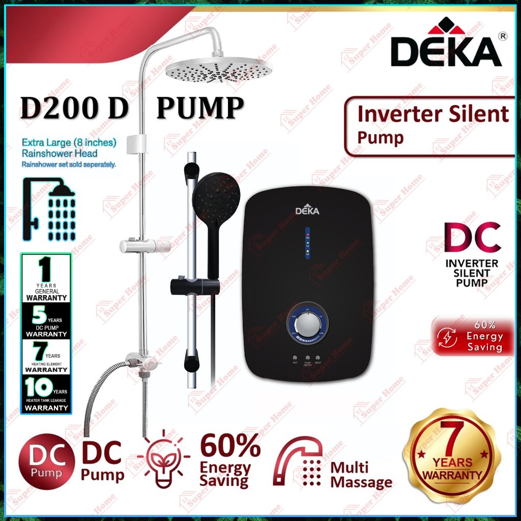 Deka Water Heater D200 MB (Matt Black) DC Inverter Silent Pump Instant Water Heater + Rain Shower Set RS10