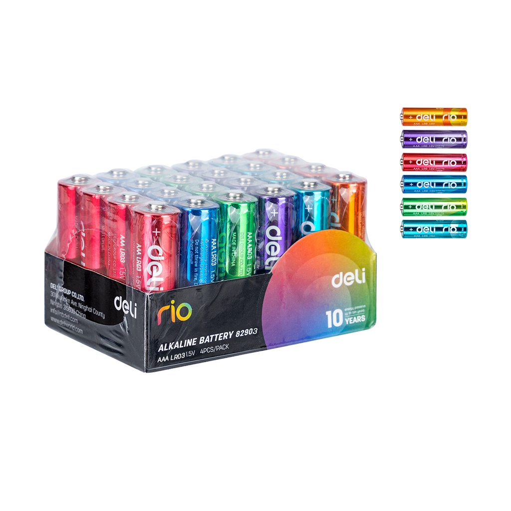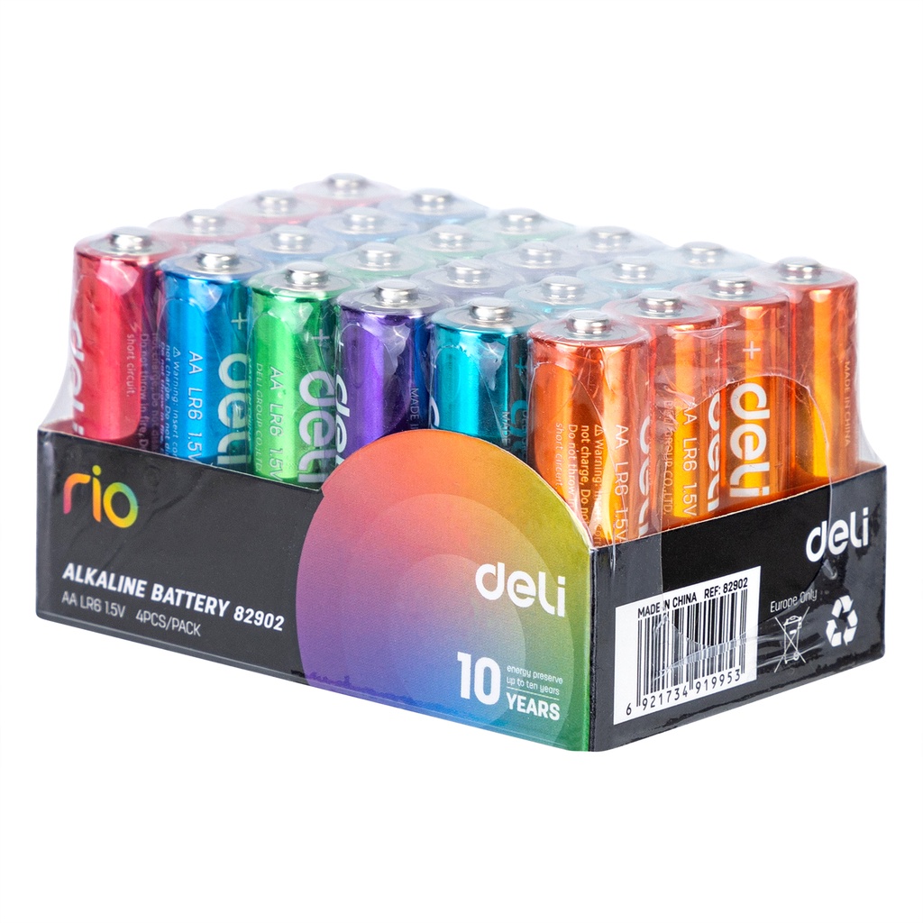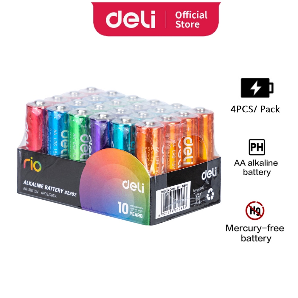 Deli Battery E82902 Alkaline Battery 10 Year Shelf Life 30% Longer Lasting AA LR6/AAA LR03 (4 Pcs/Pack) E82903