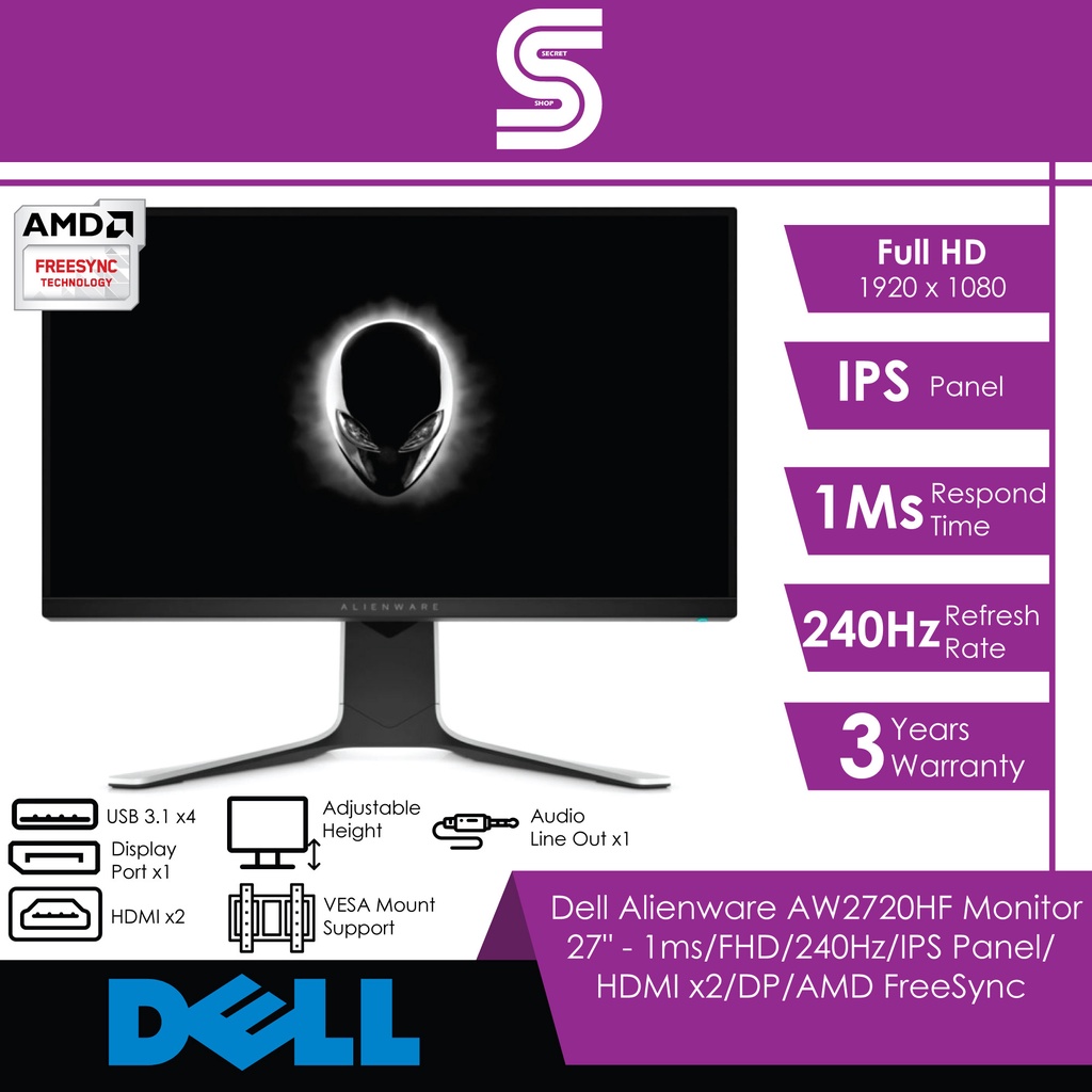 Dell Alienware AW2720HF Monitor 27" - 1ms/Full HD/240Hz/IPS Panel/HDMI x2/DP/AMD FreeSync
