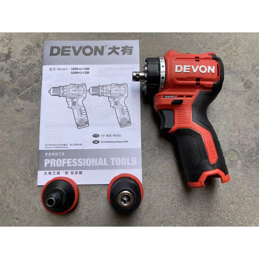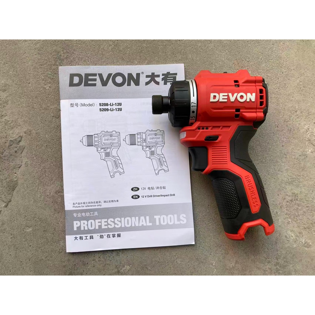Devon 5208U [New Style] 12V Lithium Battery Brushless Multi-Function Electric Drill High Power High Torque Portable Electric Drill, Brand New Genuine Product Ready Stock, Not Universal with Old 12v Platform Battery Charger.