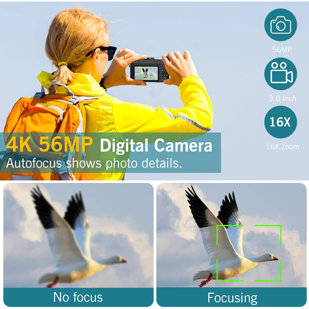 Digital Camera, Vlogging Camera, 4K 56MP Point and Shoot Cameras for Photography and Video with Manualfocus, 16X Digital Zoom