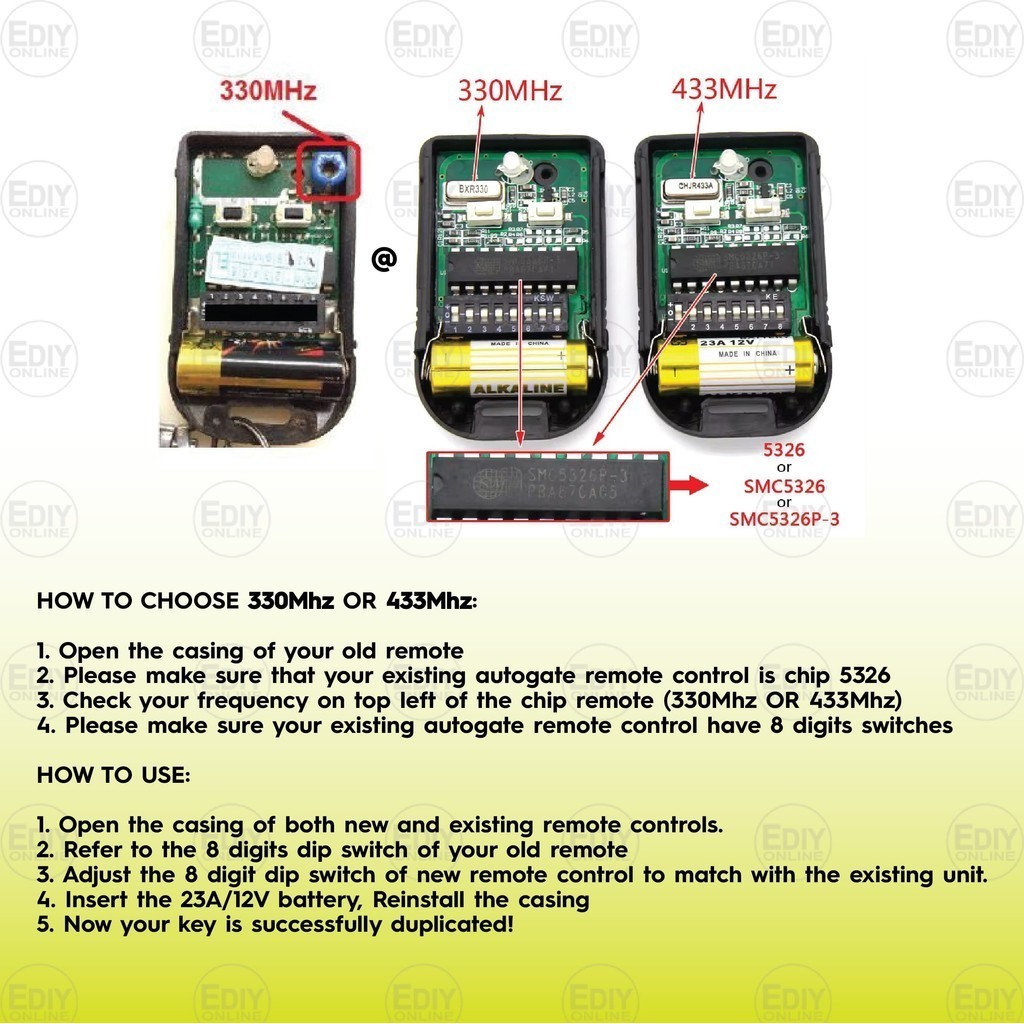 Direct Copy AutoGate Door Remote Control Chip SMC5326 5326 330MHz 433MHz Wireless Battery Auto Gate 23A