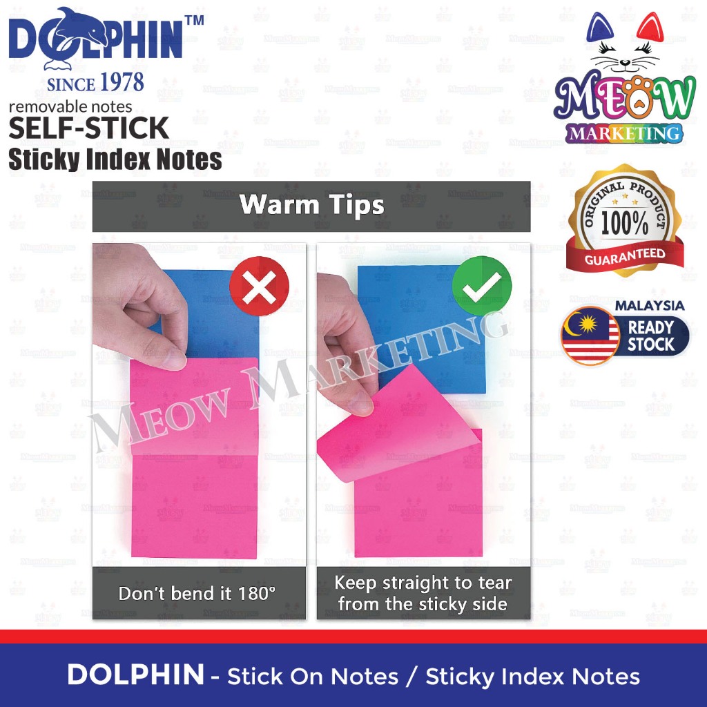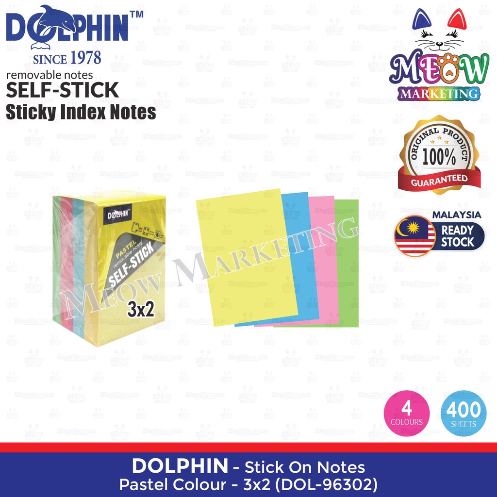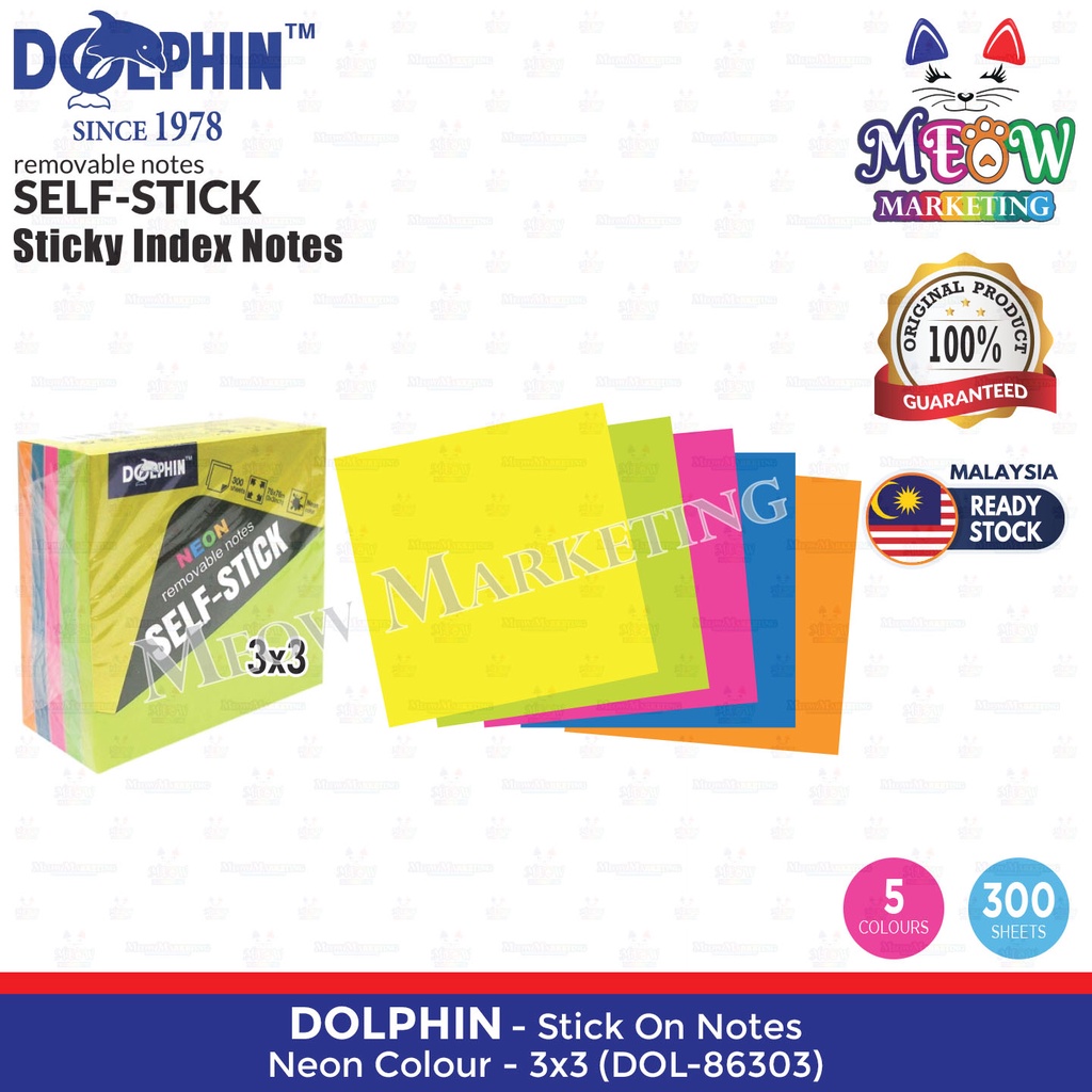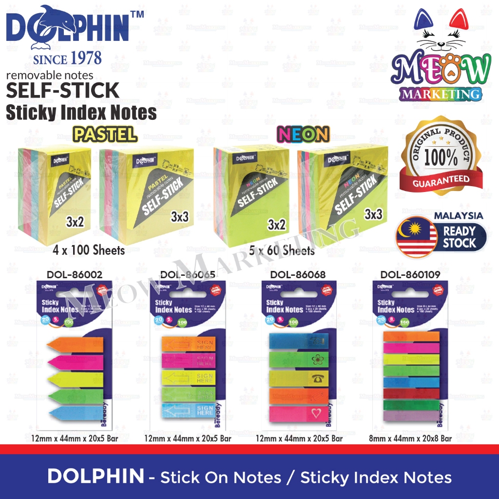 Dolphin Self Stick Notes / Sticky Index Notes - Pastel Colour / Neon Colour