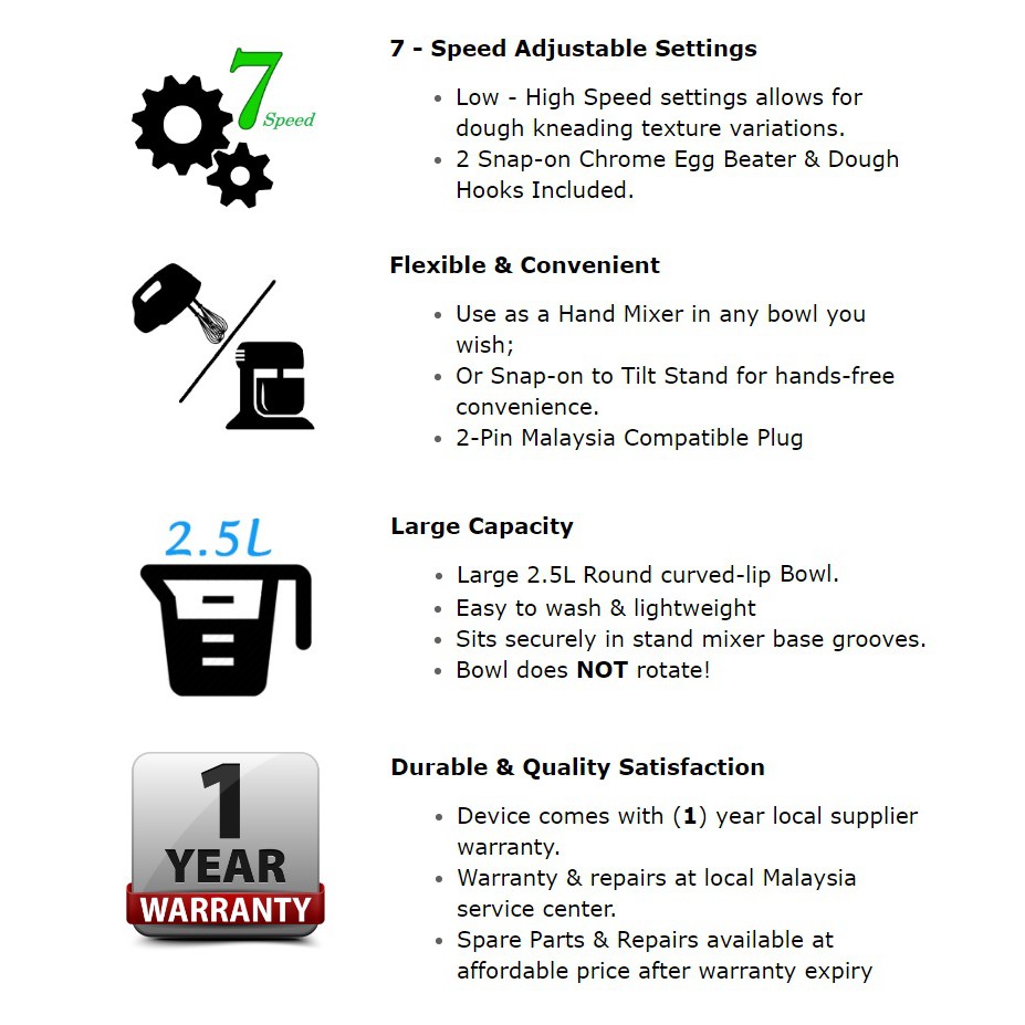 Double Beater 7 Speed Hand Stand Mixer 2.5L Bowl w/ Stainless Steel Mix & Whisk Beater Baking Pengadun Tepung Telur kek