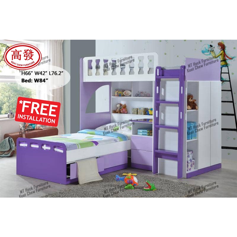 Double Decker Study Bed Children Bedroom Set 2 Single Bed + Study Table + Wardrobe Katil Budak
