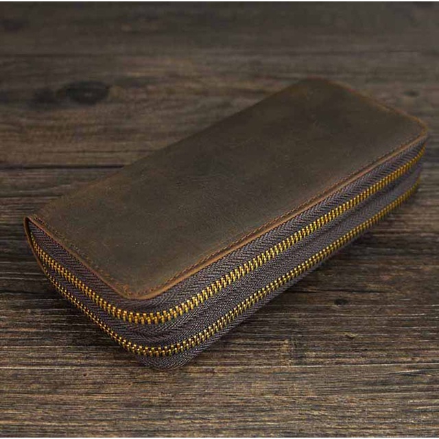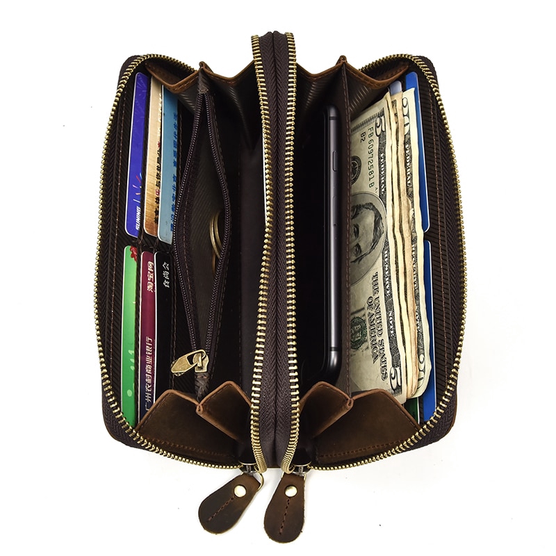 Double Zipper Men Long Wallet Vintage Leather Male Clutch Purse Genuine Leather Money Bag Bank Card ID Card Holder Large Capacity Business Male Purses Fashion Multi function