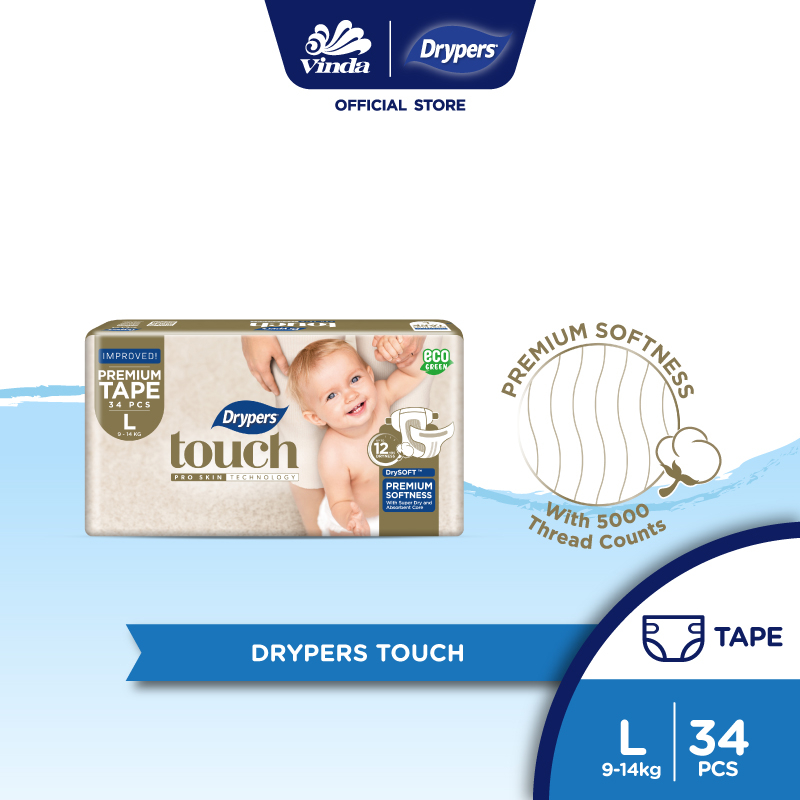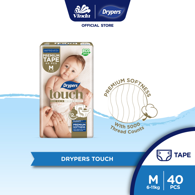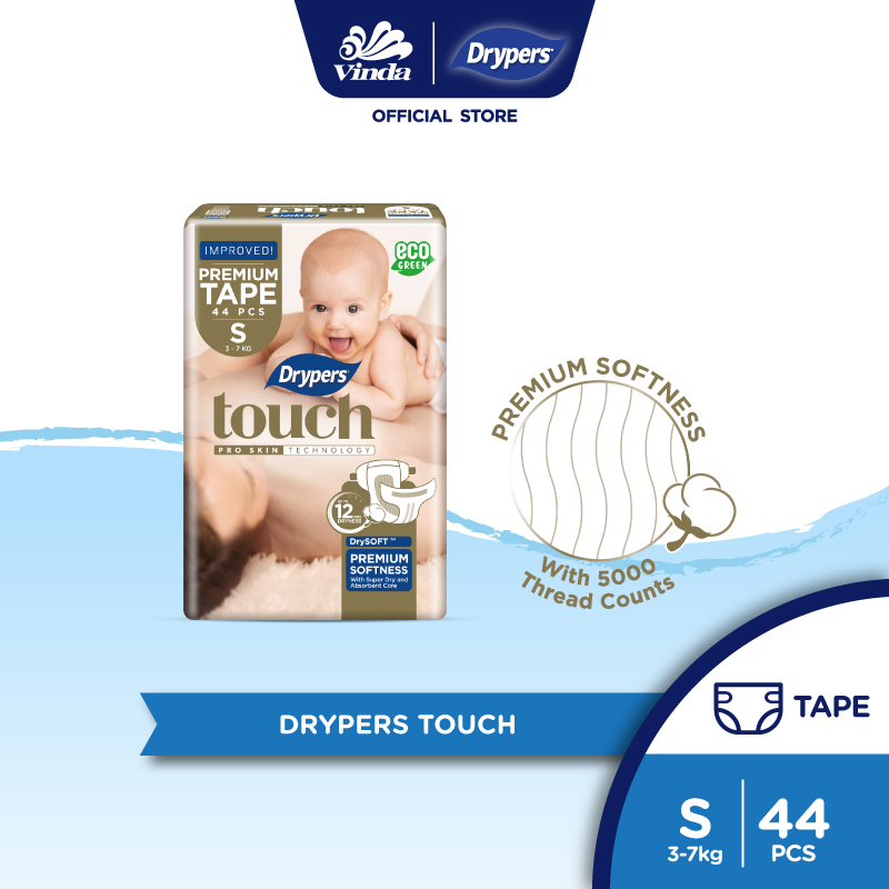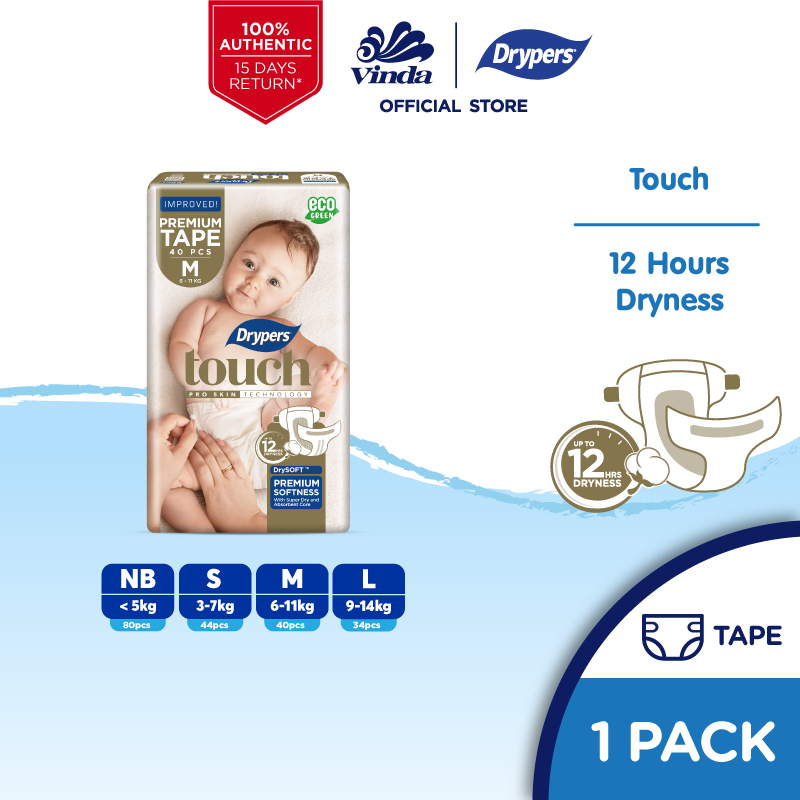 Drypers Touch Baby Diapers S44/ M40/ L34/ XL30/ XXL 24 (1 Pack)