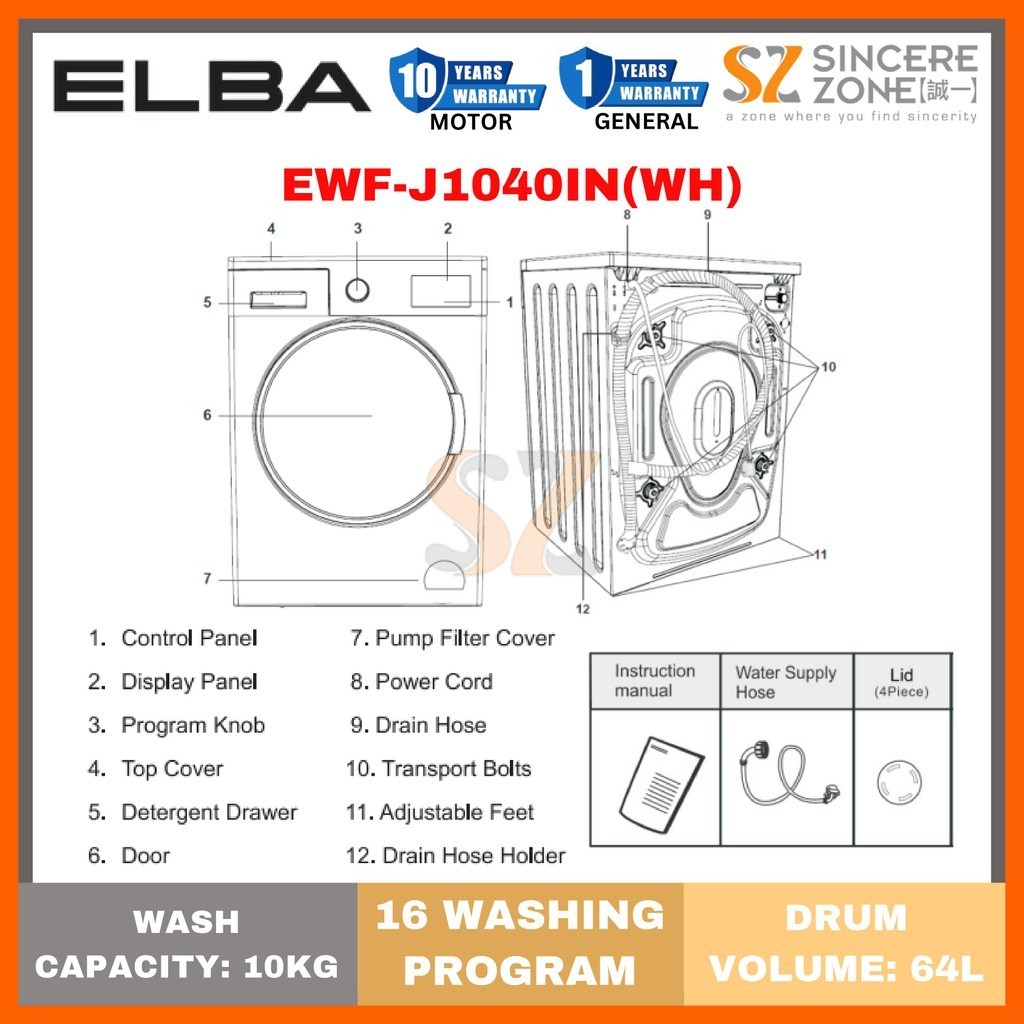 ELBA EWF-J1040IN(WH) 10KG Front Loading Washer I 16 Washing Programmes I Inverter Motor