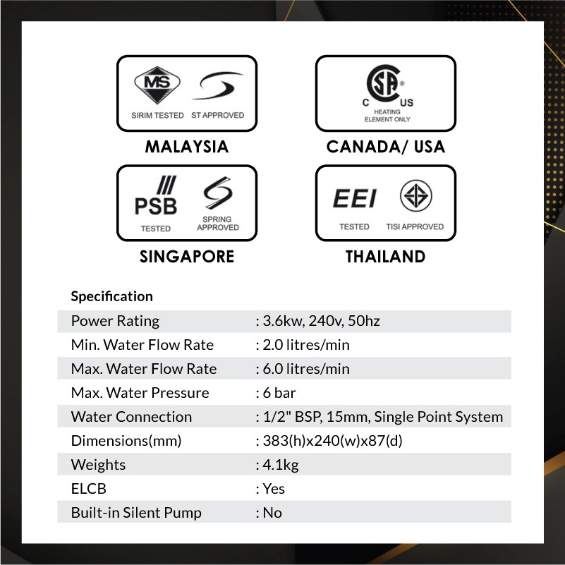 ELTON e30 Electric Instant Water Heater 6Bar Water Pressure ELCB System Splash Proof Casing