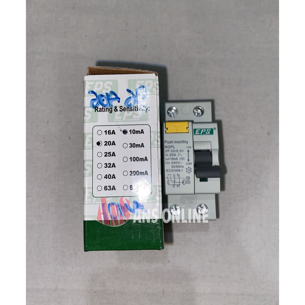 EPS 20A 2POLE 10MA ELCB / RCCB ( 0.01MA ) RESIDUAL CURRENT CIRCUIT BREAKER