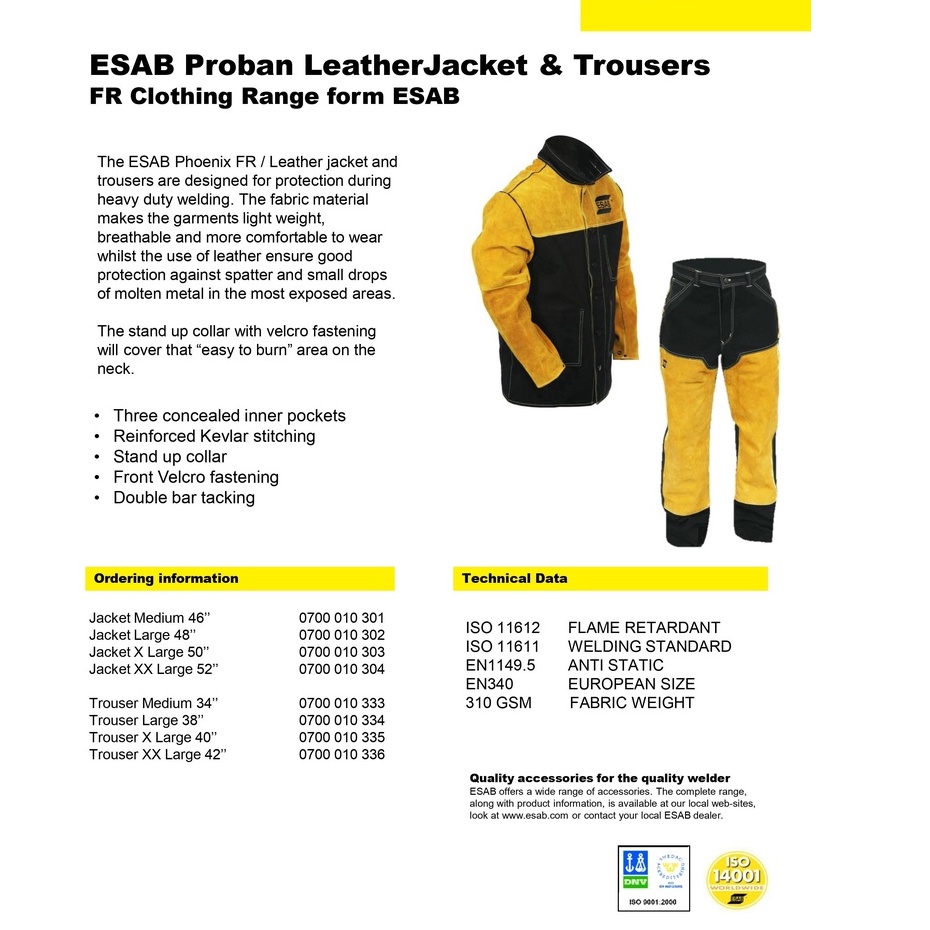 ESAB WELDING JACKET - VARIOUS SIZES / 0700010301 / 0700010302 / 0700010304