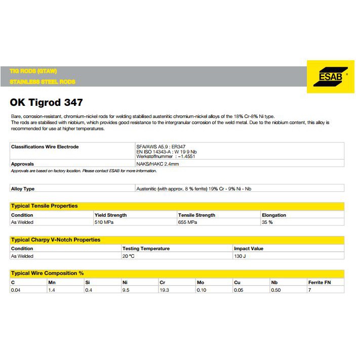 ESAB Welding Tig Rod ER347 (OK Tigrod 347) - for Stainless Steel 321 & 347 -- ER347
