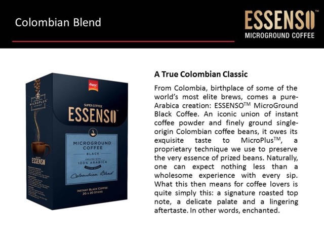EXP: NOV 2025: ESSENSO Microground coffee Colombian blend instant black coffee 2g X 20 sticks