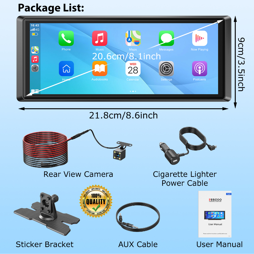 ESSGOO 8.1" INCH Portable Car Player CarPlay Android Auto FHD IPS 2.5D Touch Screen Voice Control Mirror Link AirPlay Miracast Car Radio