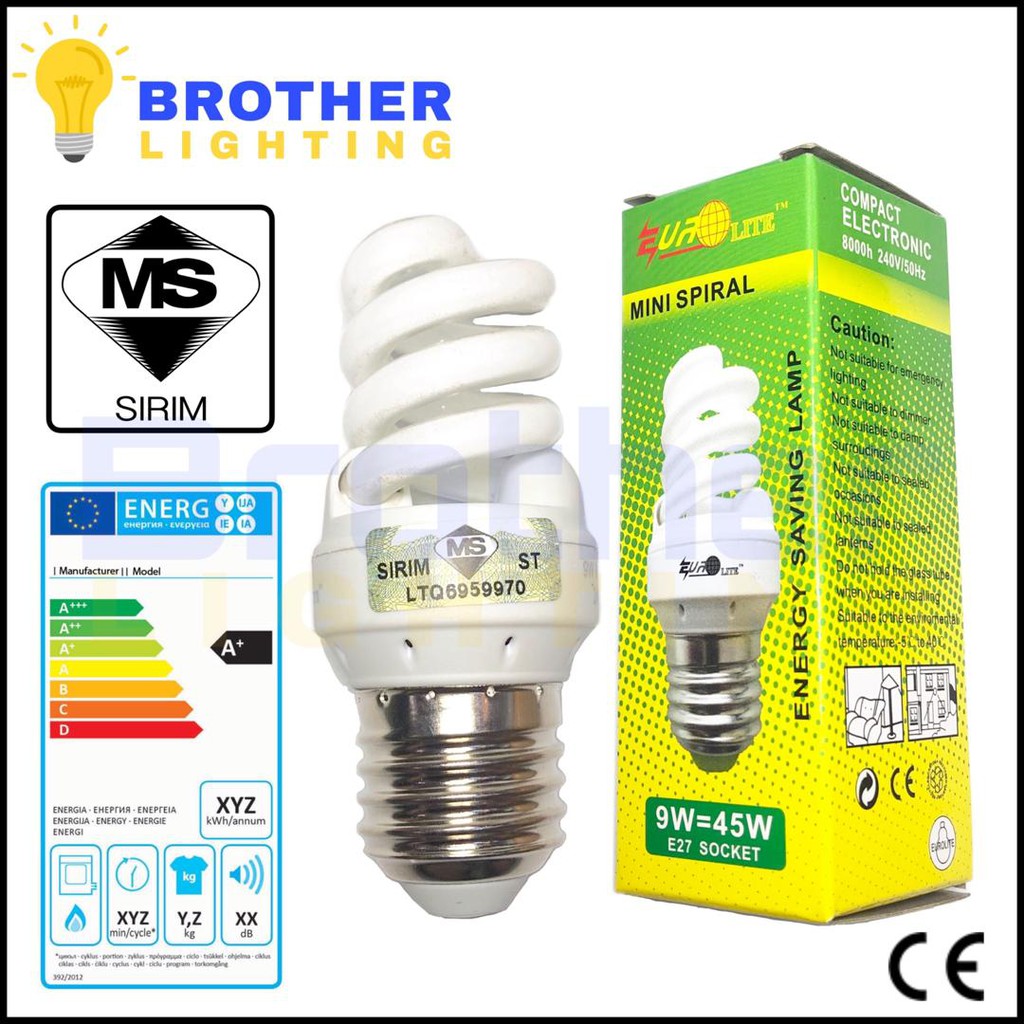 EUROLITE 9W=45W E27 Energy Saver Light Bulb Energy Saving Lamp Compact Electronic Sirim Aprroved (Warm White/Daylight)