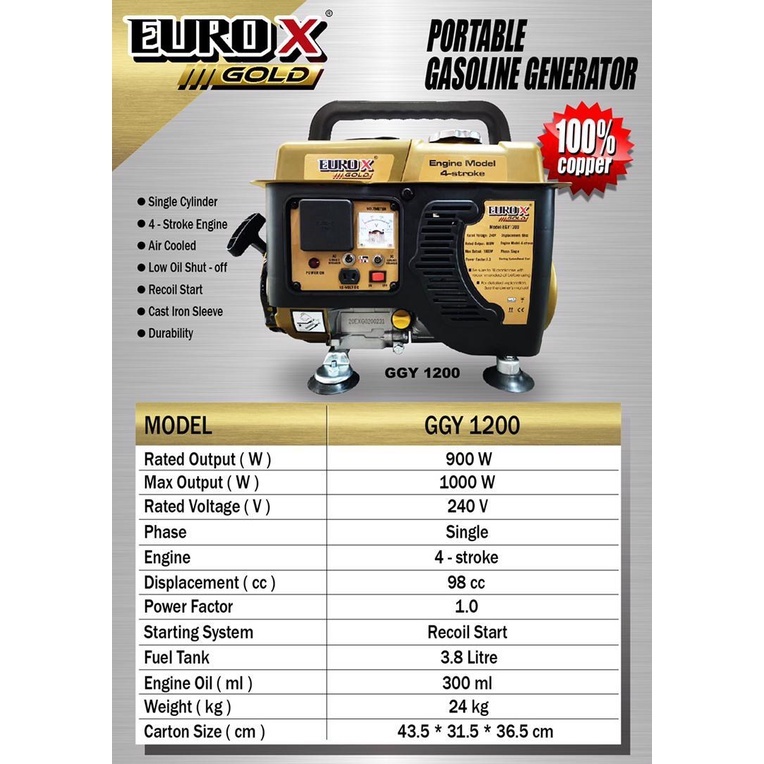 EUROPOWER GASOLINE GENERATOR 1000W - 4 STROKE ENGINE EGY1200 / GGY1200 | TOKAI EC1200CXI | JETMAC JGY1200