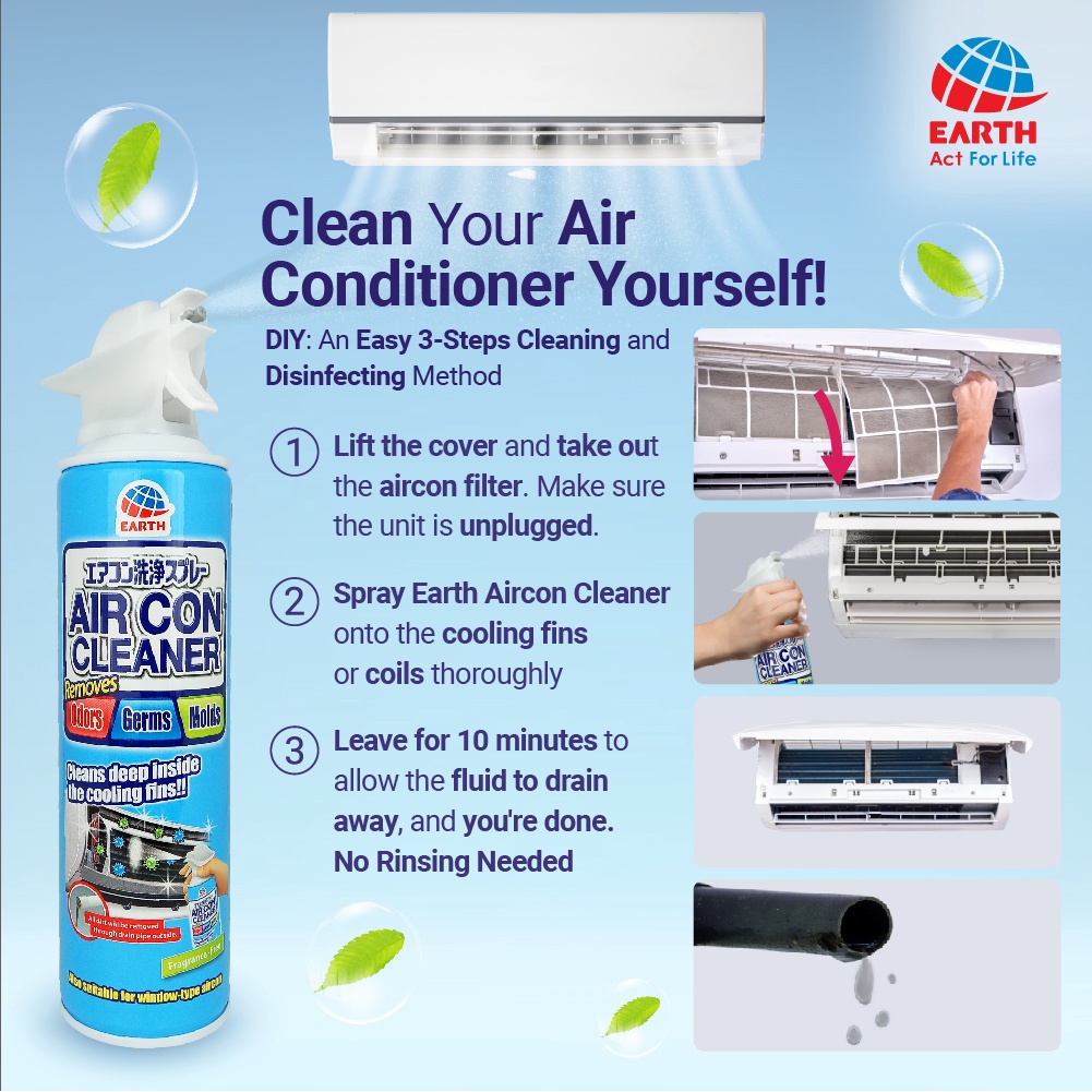 Earth Air Con Spray Cleaner Non Fragrance 420ml DIY Eliminates >99.9% Bacteria & Viruses Dust Suppressor Agent
