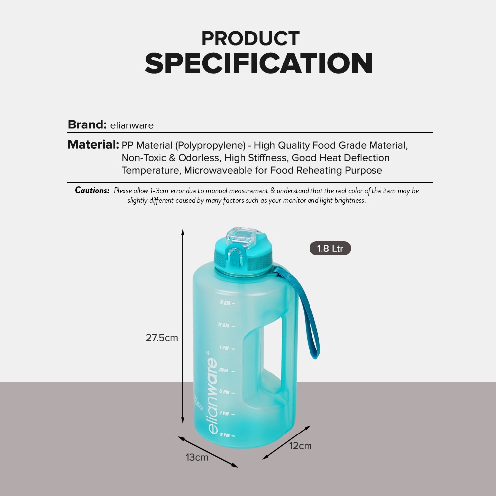 Elianware BPA Free Handle Big Volume Water Bottle Sport Outdoor Botol Tumbler with Straw (1800ml)