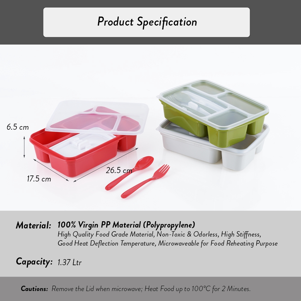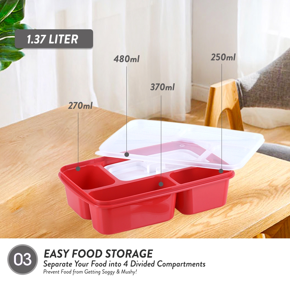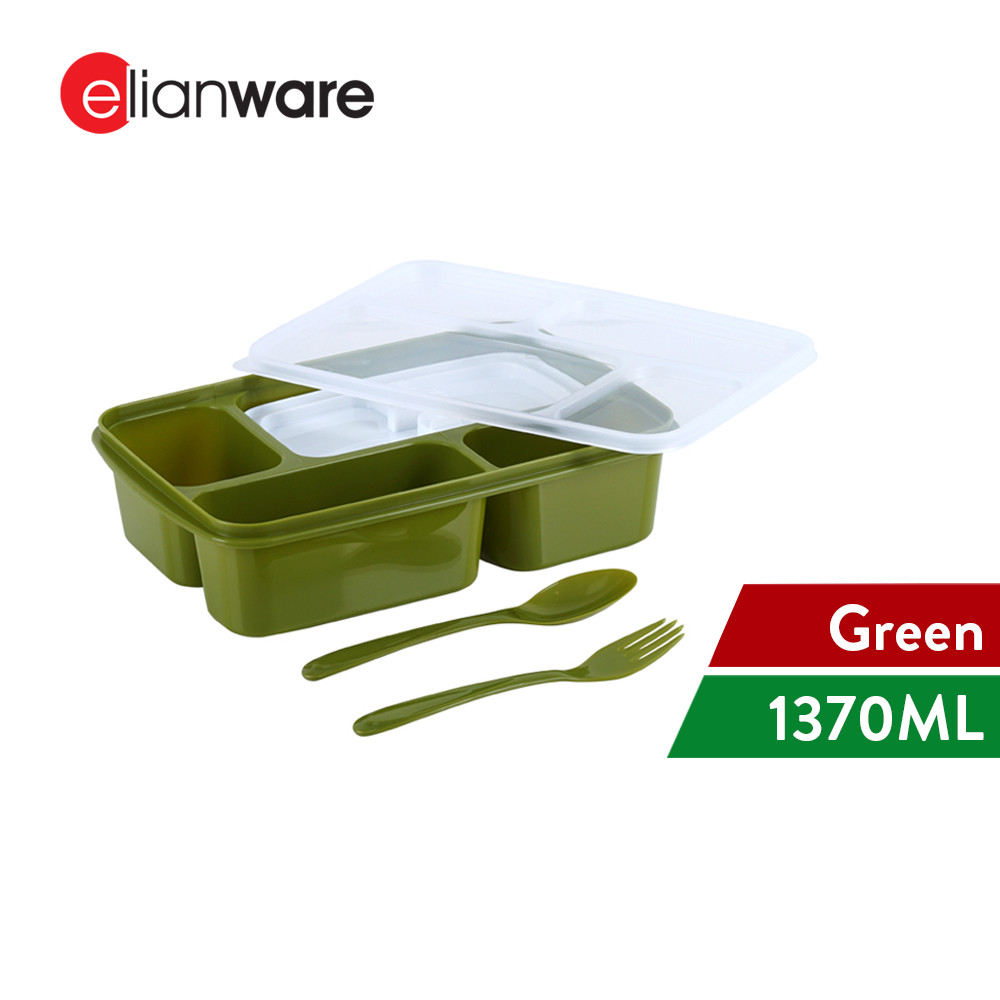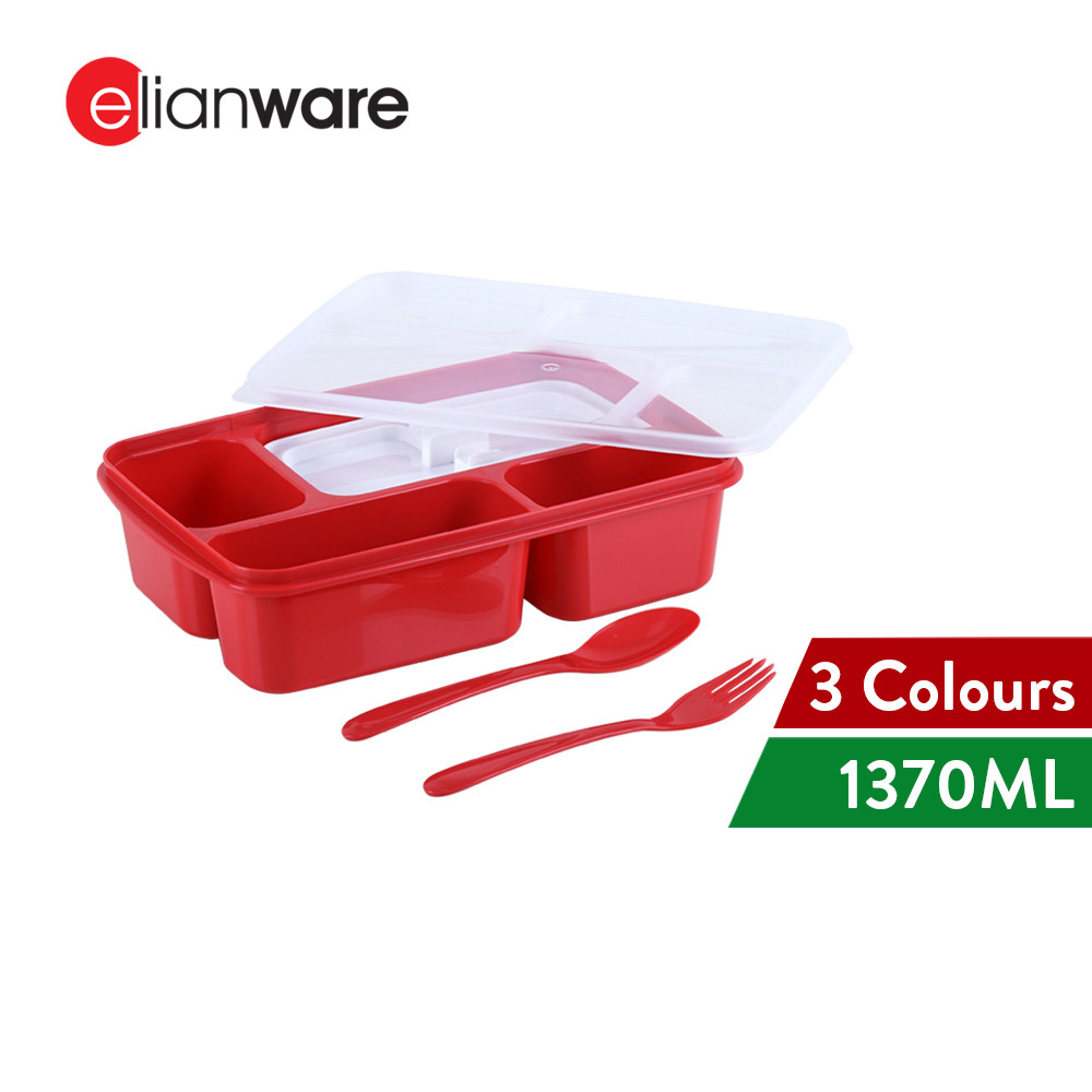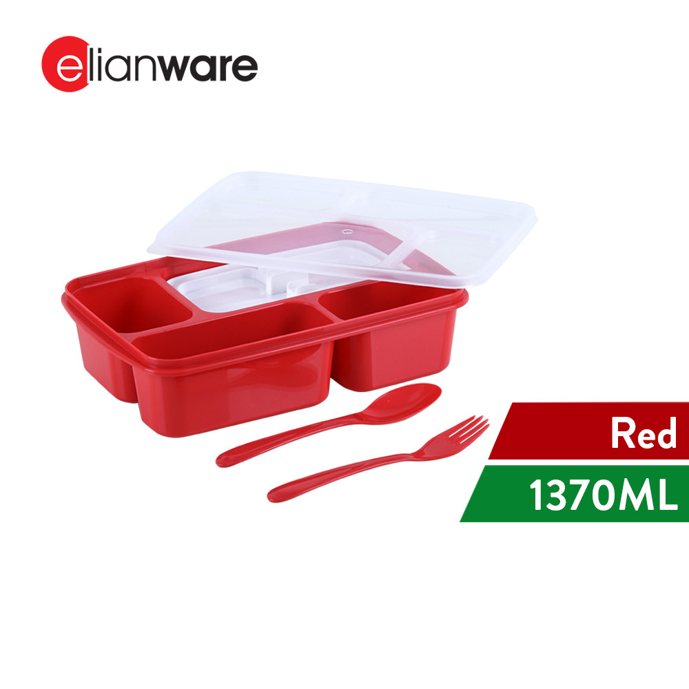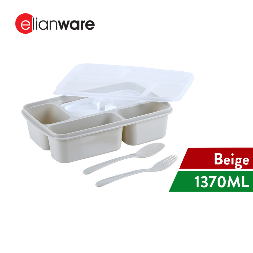 Elianware Portable Divided 4 Compartments Bento Lunch Box with Fork & Spoon (1.37L)