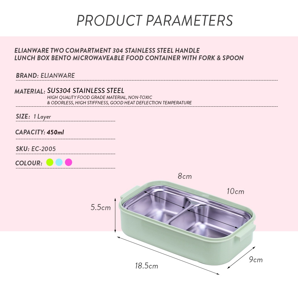 Elianware Two Compartment 304 Stainless Steel Handle Lunch Box Bento Microwaveable Food Container with Fork & Spoon