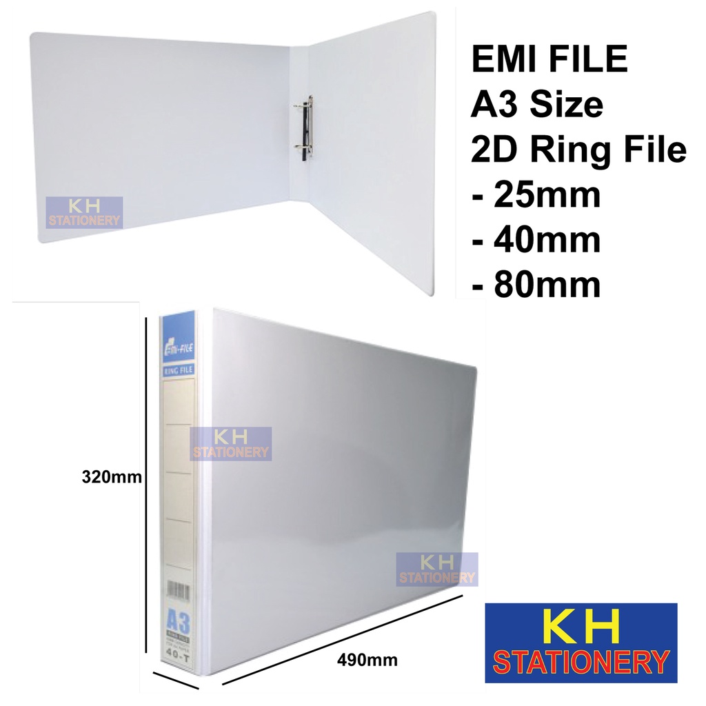 Emi A3 2D Ring File 25mm, 40mm, 65mm /80mm/ File for A3 Size Document / PVC White A3 File