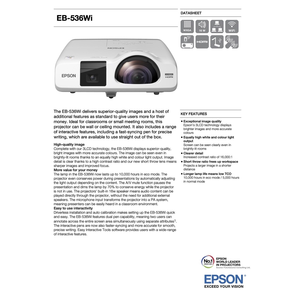Epson EB-536Wi 3400 Lumens Short Throw Interactive WXGA 3LCD Projector