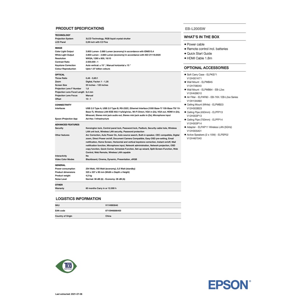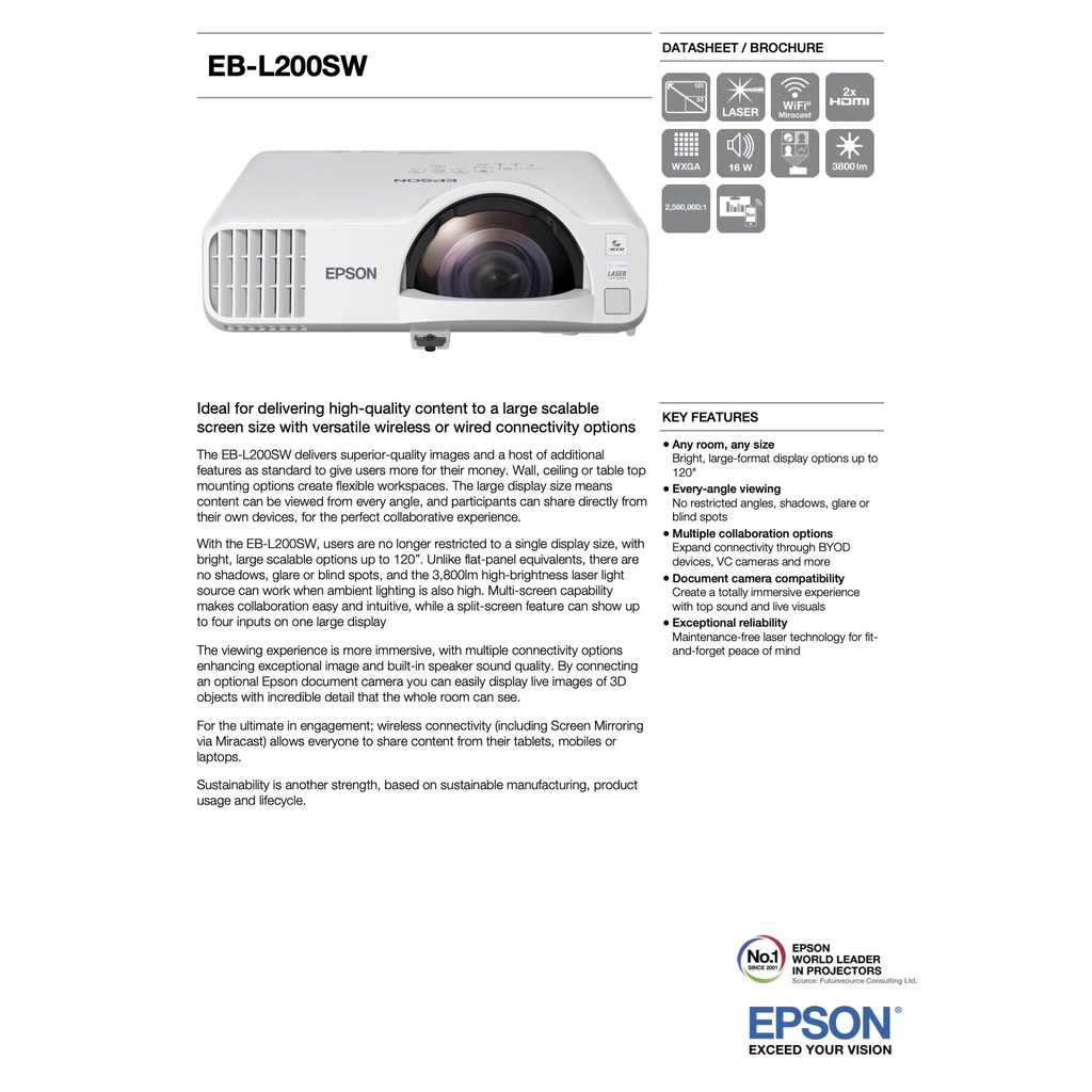 Epson EB-L200SX 3600 Lumens XGA / EB-L200SW 3800 Lumens WXGA Wireless 3LCD Short-throw Laser Projector