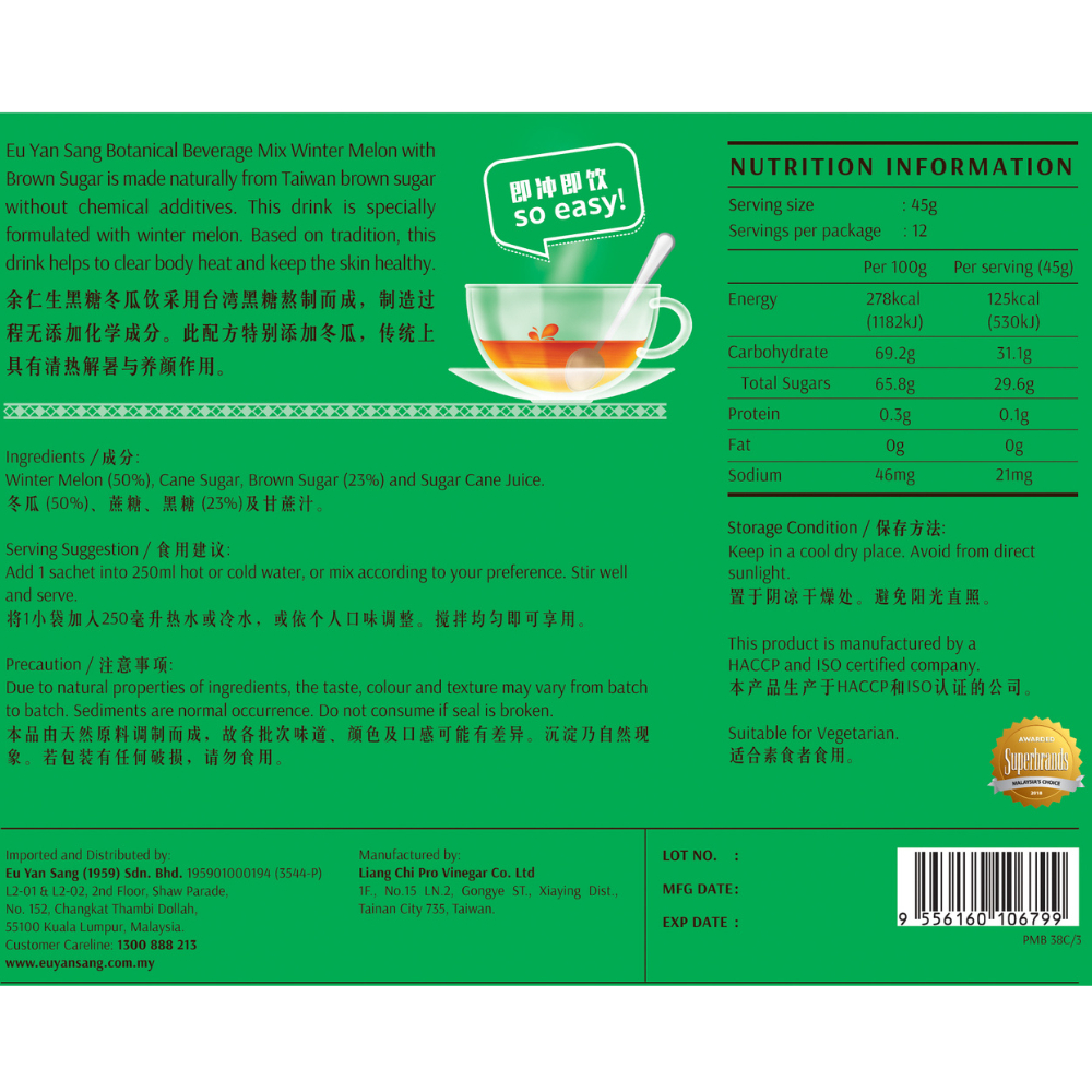 Eu Yan Sang Botanical Beverage Mix Winter Melon with Brown Sugar 黑糖冬瓜饮 (45g x 12 packs)