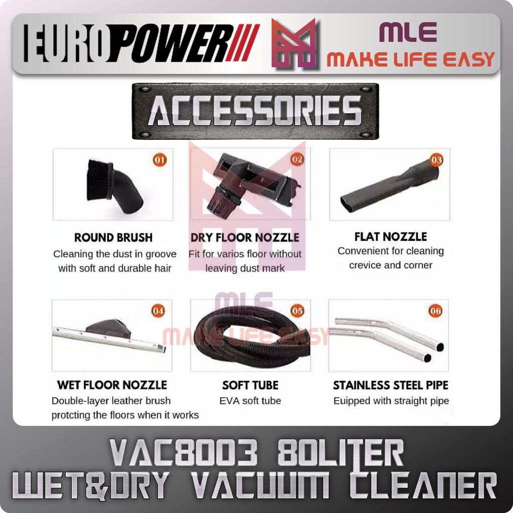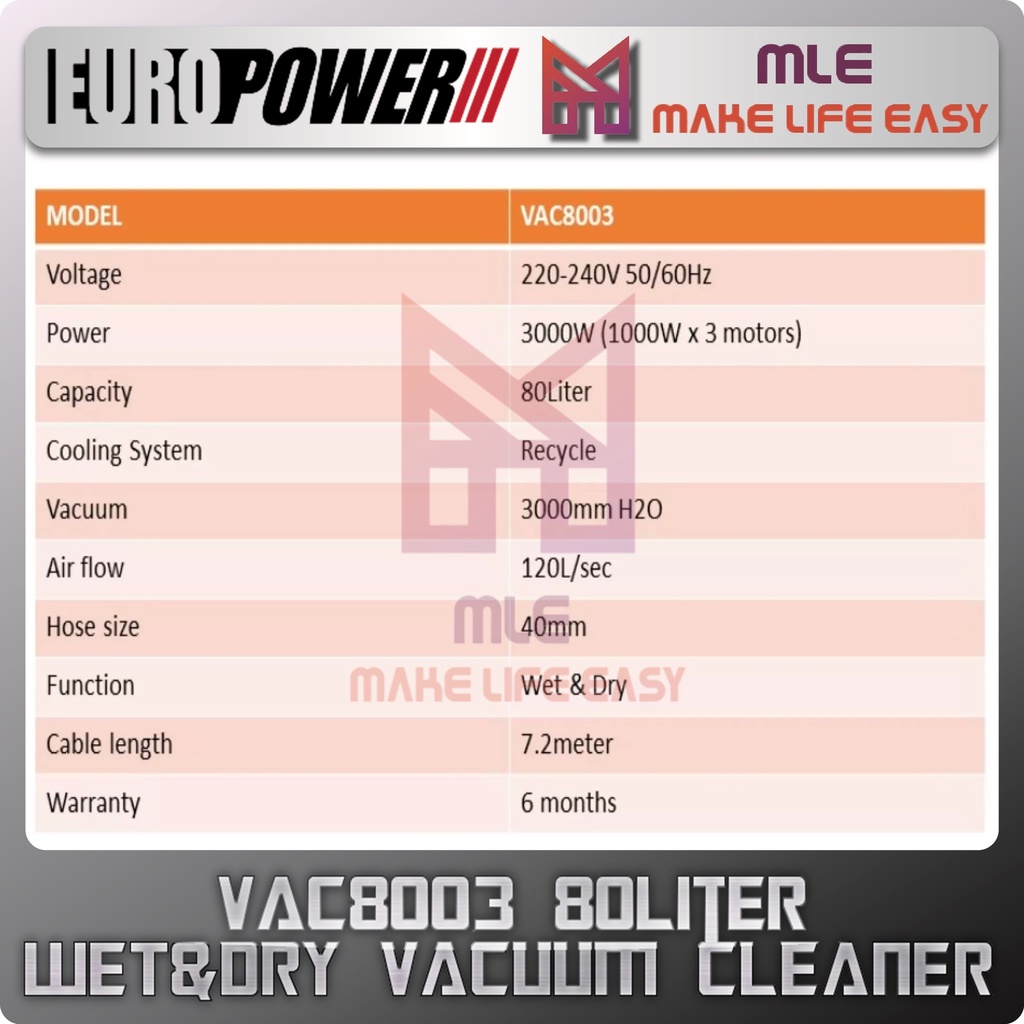 Europower VAC8003 80Liter Industrial Vacuum Cleaner Machine 3000w