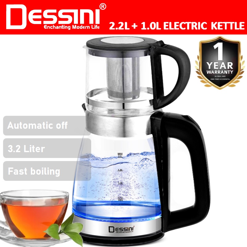【ORIGINAL】 DESSINI ITALY 2.2L + 1.0L Glass LED Light Electric Kettle Automatic Cut Off Boiler Jug Teapot / Cerek