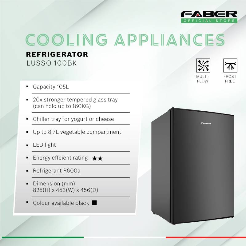 FABER 105L Refrigerator Multi-Flow Single Door Fridge LUSSO 100BK / Mini Bar / 1 Pintu Peti Sejuk