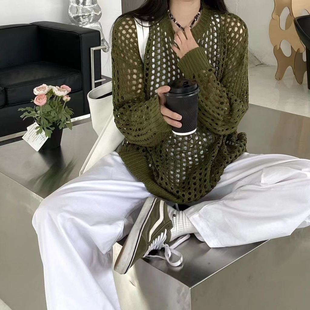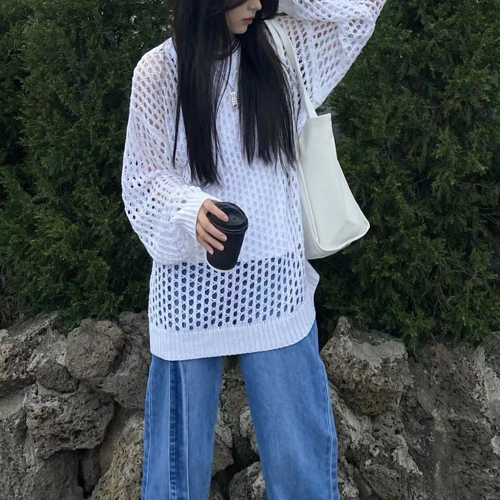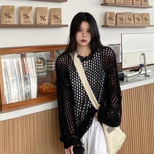 Fashion Korean Round Neck Long Sleeve Women Blouse Sweater Short Tops Hollow-out