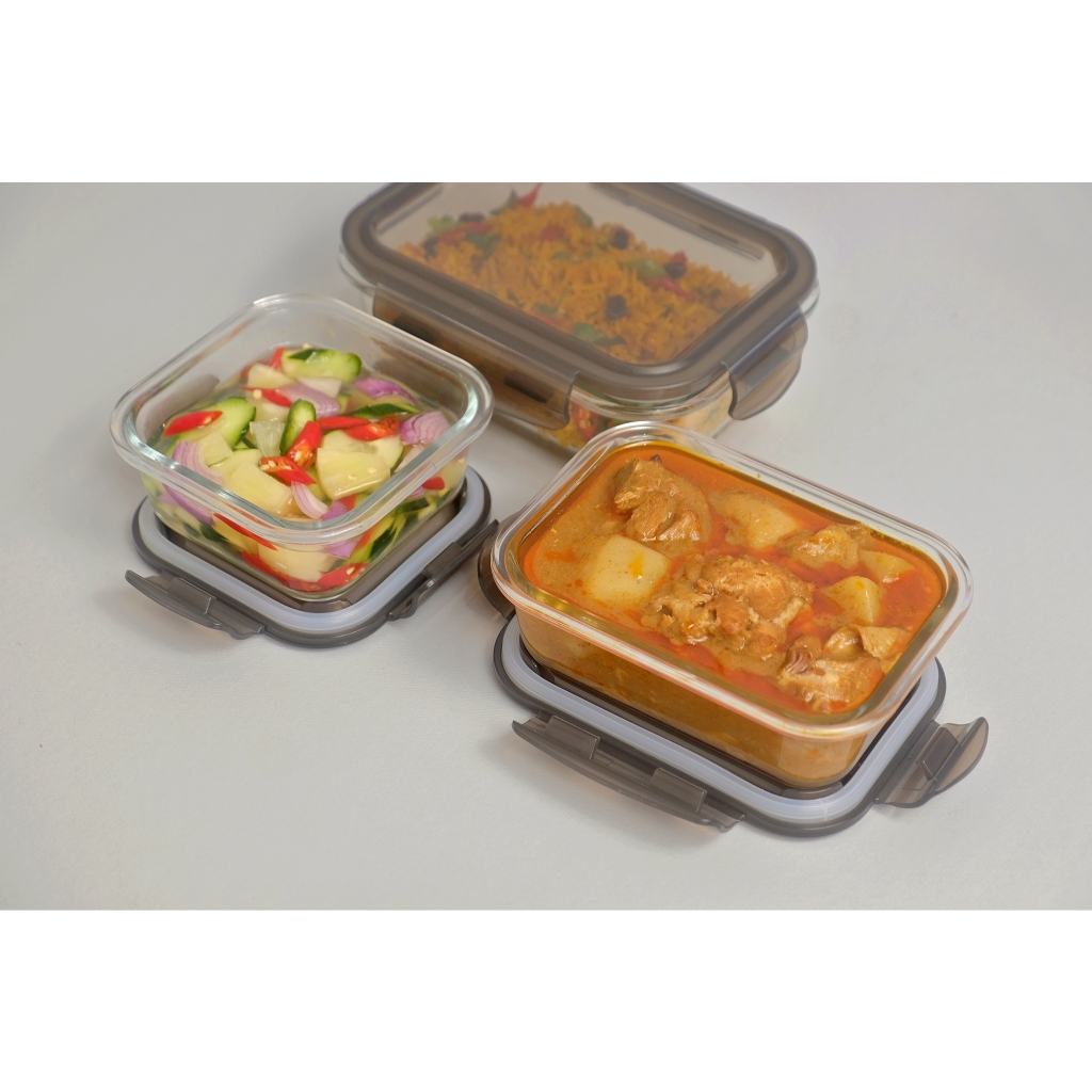 Felli Ecolock Borosilicate Glass Food Storage Container Square & Rectangle Set (3 Pcs) - Larva Grey