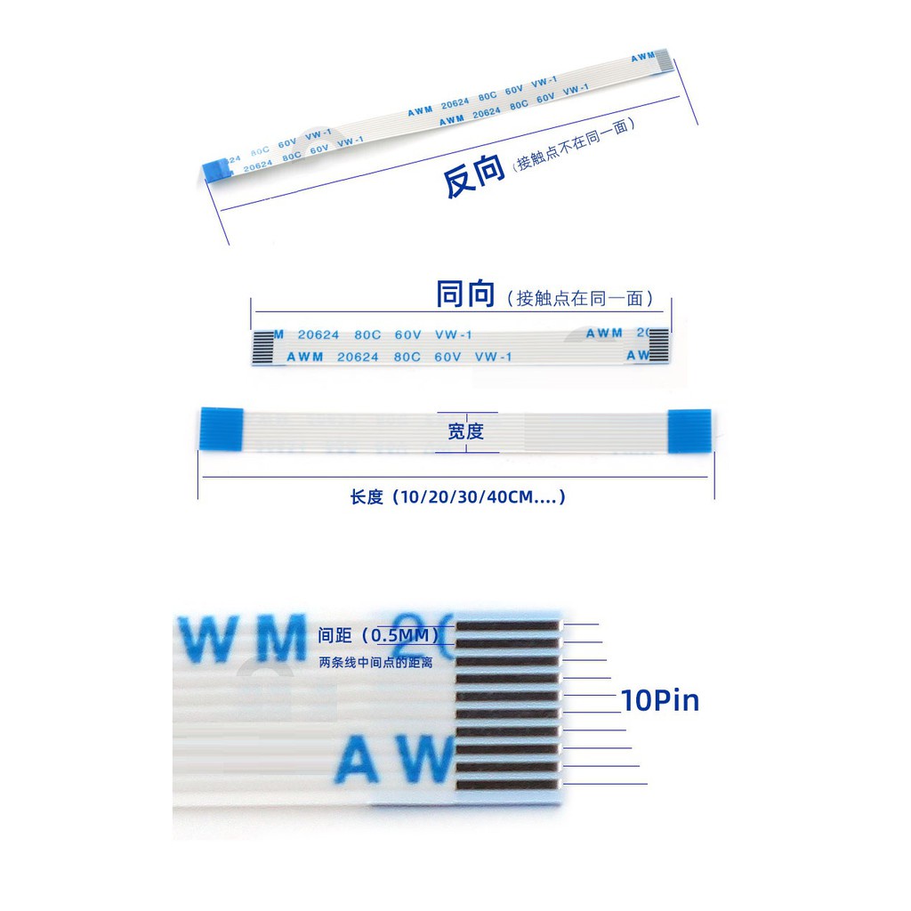 FFC/FPC Flexible Flat Cable LCD Connection Cable 6P Co-Directional/Reverse 0.5/1.0mm Pitch 6/10/15/20/25~40CM