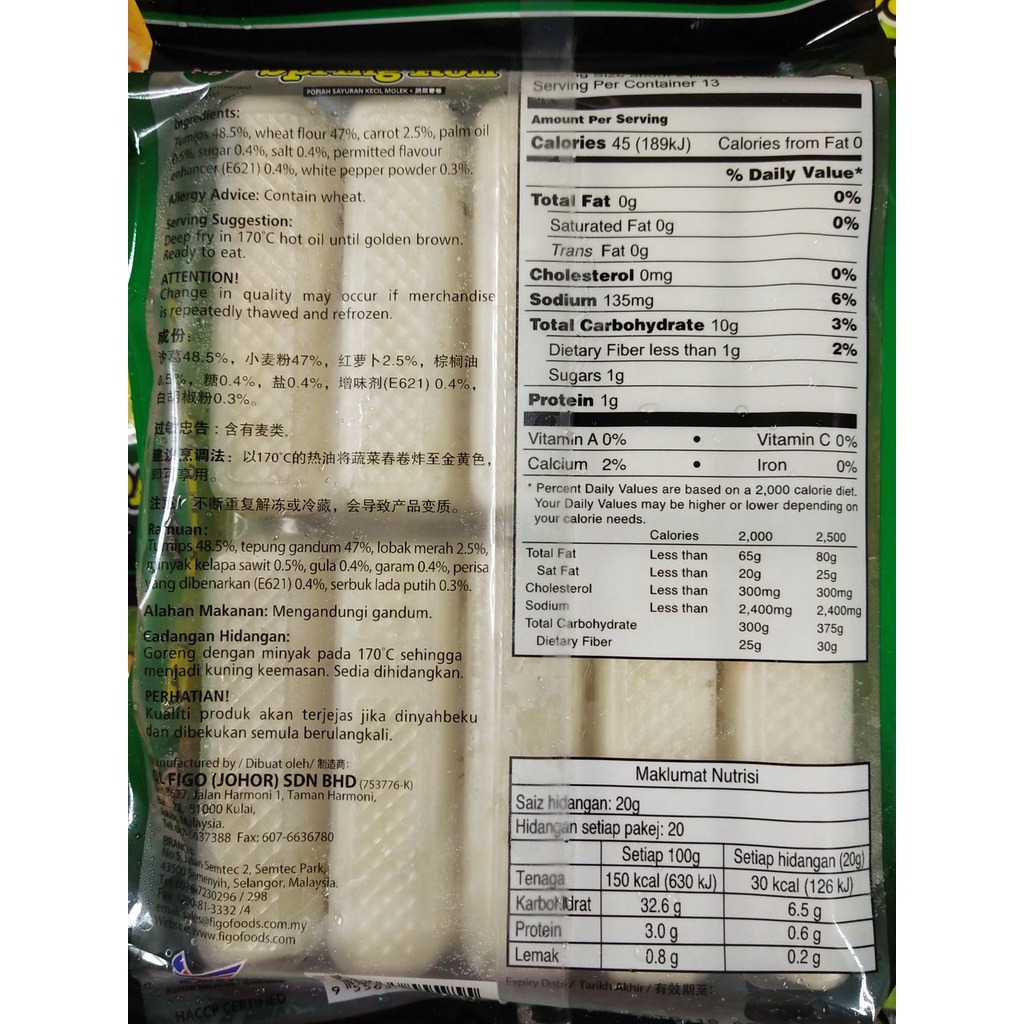 [SHCF] Figo Premium Vegetable Spring Roll 20pc. 400g Frozen Popiah Sayuran Kecil Molek