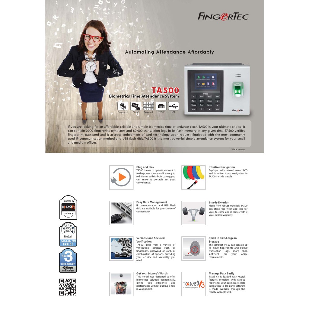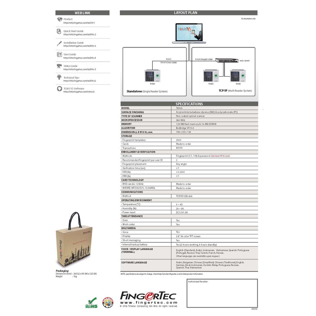 FingerTec TA500 Biometric Fingerprint Thumbprint Time Attendance Machine Fingerprint Mesin Kehadiran