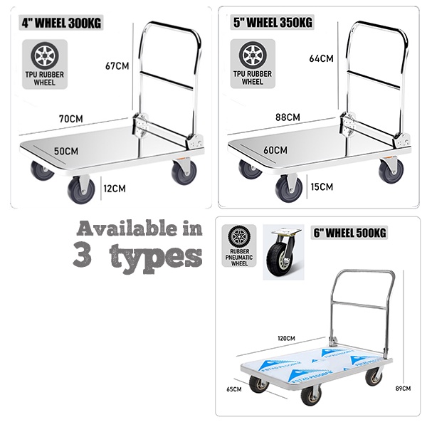 Foldable Platform Hand Truck Trolley Stainless Steel Max Load 500kg 350kg 300kg Troli Barang Heavy Duty 4 Wheel Cart