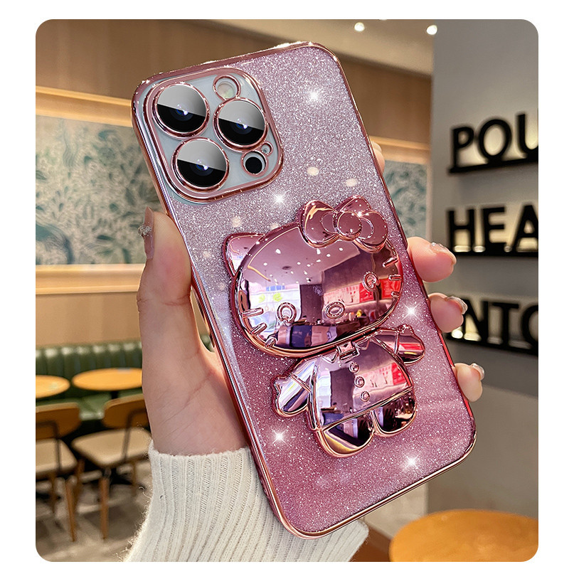For OPPO A52 A53 A54 A55 A57 A58 A74 A76 A77 A77S A78 A79 Cartoon Hello Kitty Phone Case Luxury Chrome Glitter Phone Cover Cute KT Mirror Case + Folding Stand