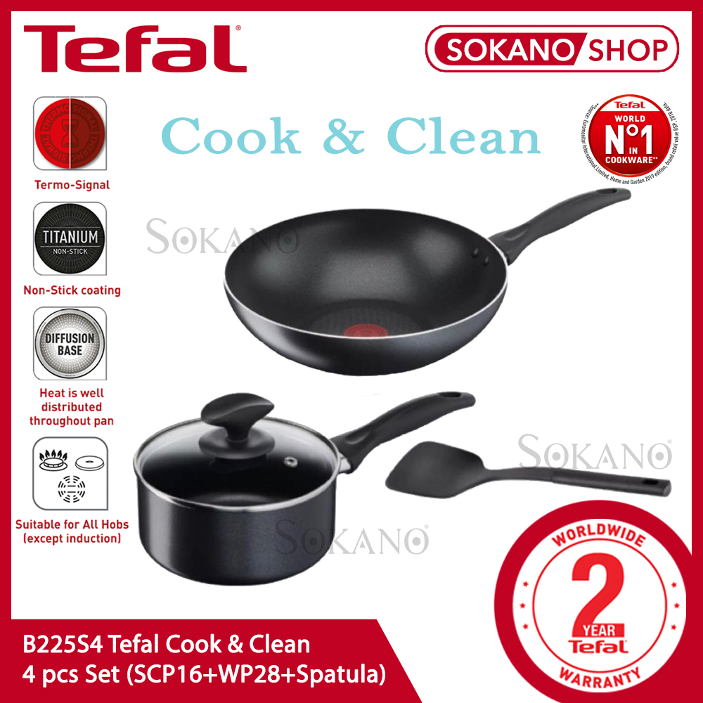 ❤️Ready Stock❤️B225S4 Tefal Cookware Cook & Clean 4 pcs Set (SCP16+WP28+Spatula) Periuk Pot Pan Wok Kuali