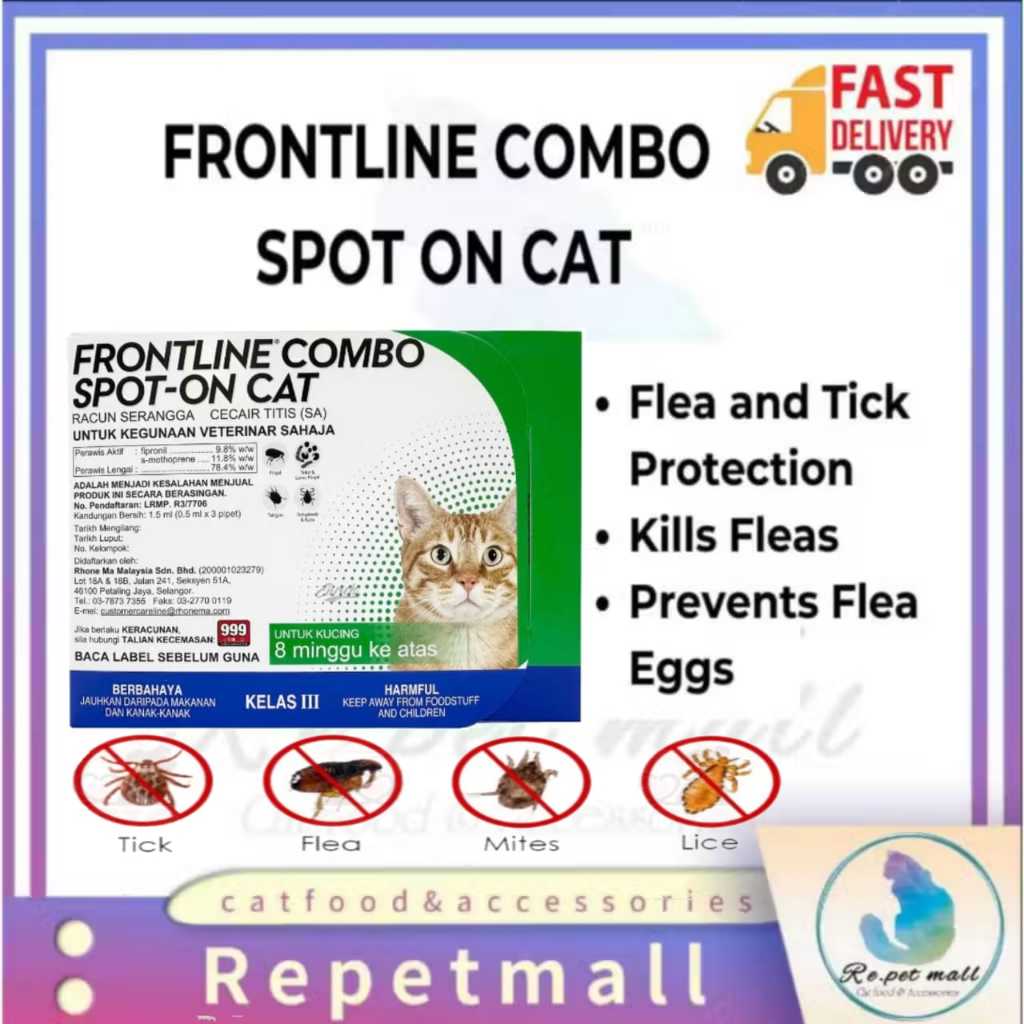 Frontline Combo Spot - On Cat 1.5ml (0.5ml x 3 Pipet)-1 Box/ Ubat Kutu Kucing/ Flea/ Mite/ Lice/ Tick