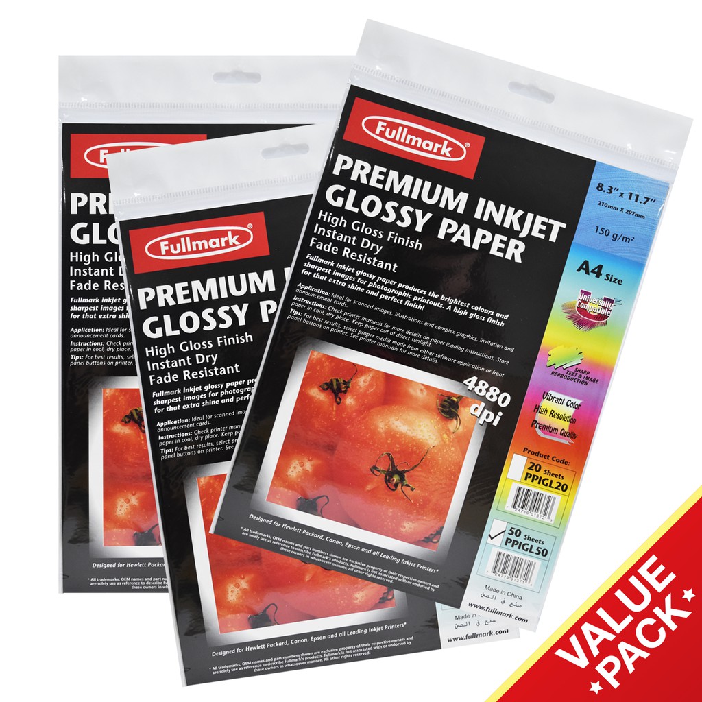 Fullmark A4 High Glossy Finish Paper Premium Inkjet 150gsm - 3 pack (PPIGL50)