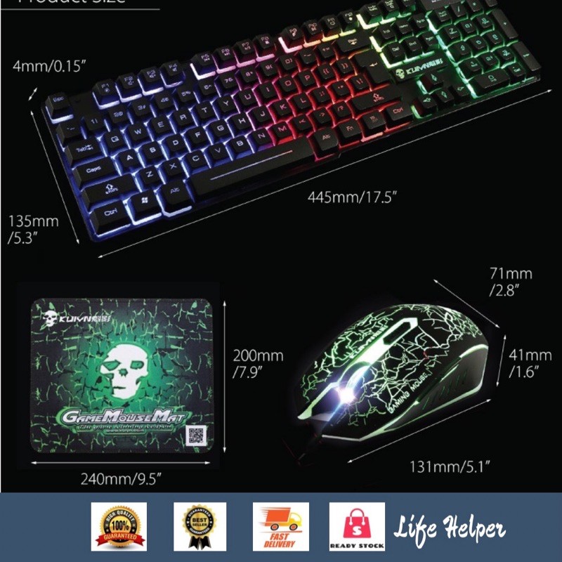 GAMING KEYBOARD SET 3 IN 1 KUIYN T6 KEYBOARD + MOUSE + MOUSEPAD Rainbow Backlight Ergonomic Gaming Keyboard Set