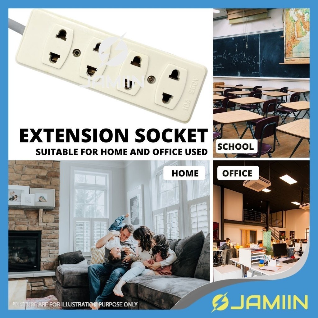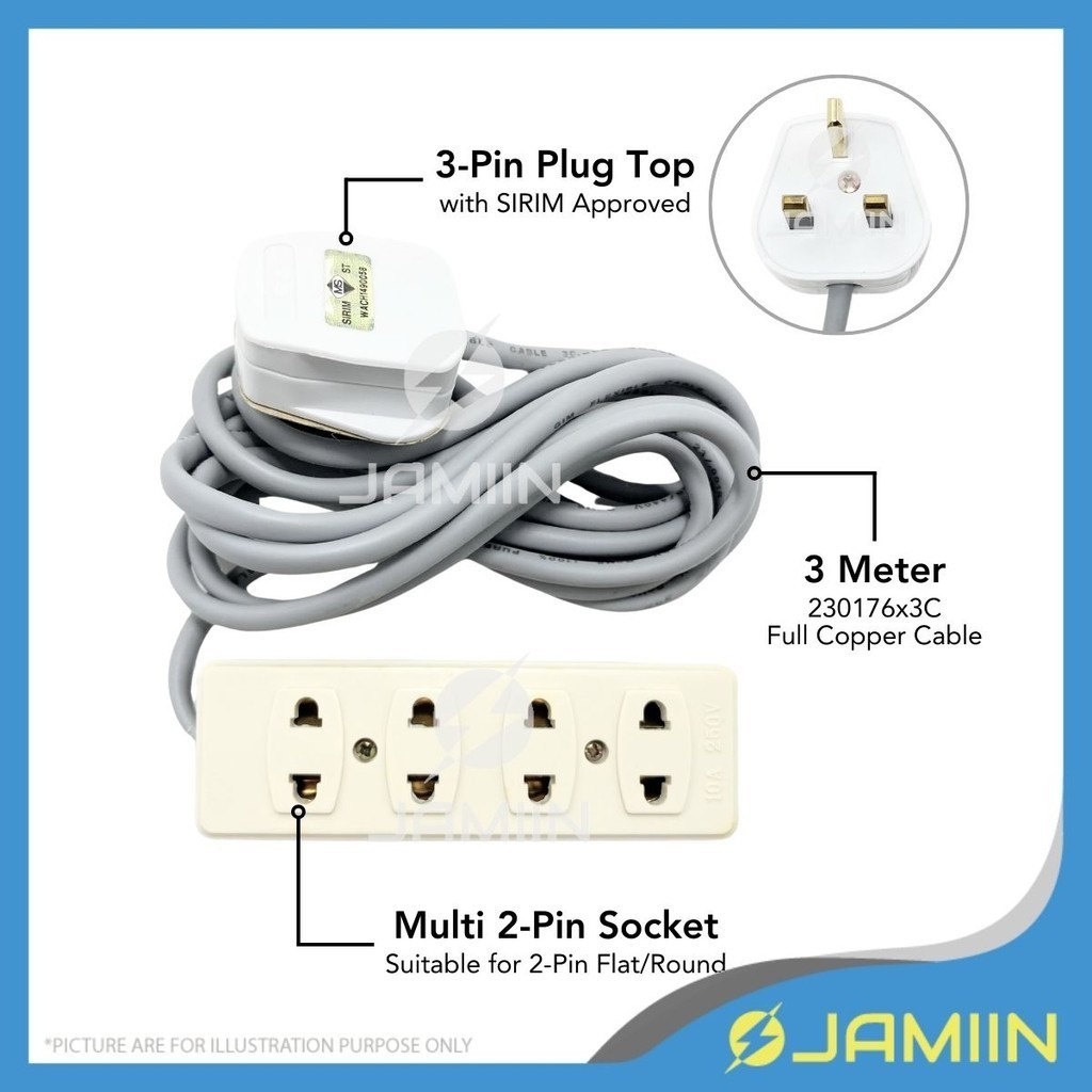 GIM 2-PIN 4-WAY 3M TRAILING EXTENSION MULTISOCKET 3-Pin Plug Top with SIRIM Socket For 2Pin Flat/Round Full Copper Cable