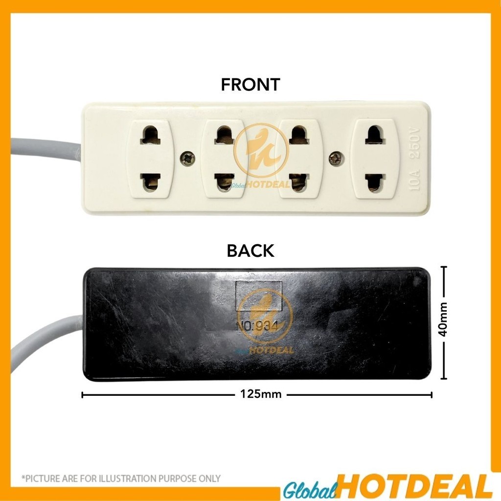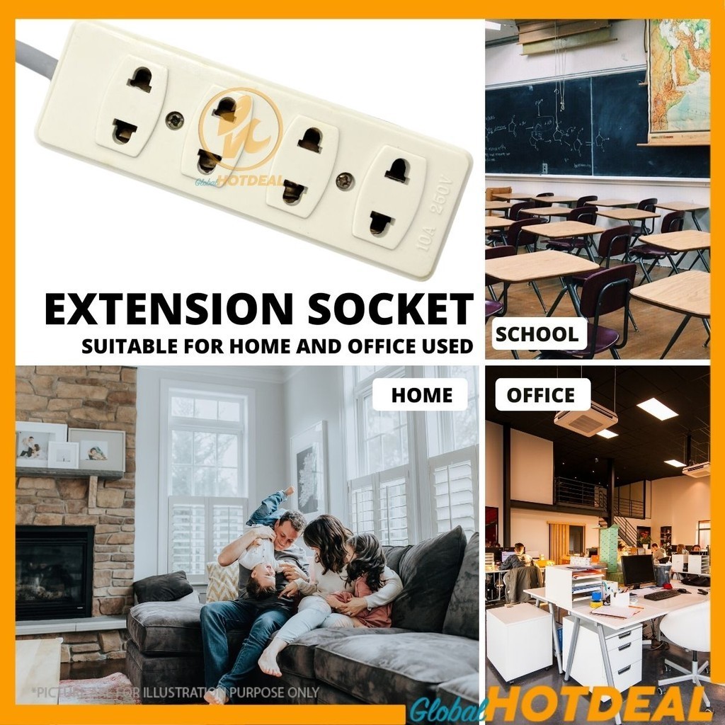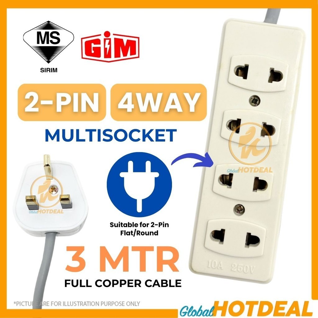 GIM 2-PIN 4-WAY 3M TRAILING EXTENSION MULTISOCKET Socket For 2Pin Flat/Round Full Copper Cable 3-Pin Plug Top with SIRIM