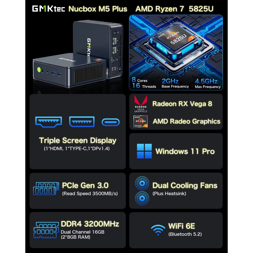 GMKtec M5 Plus AMD Ryzen 7 5825U Windows Mini PC 64GB DDR4 RAM 2TB NVME SSD WiFI 6 Gaming PC Gaming
