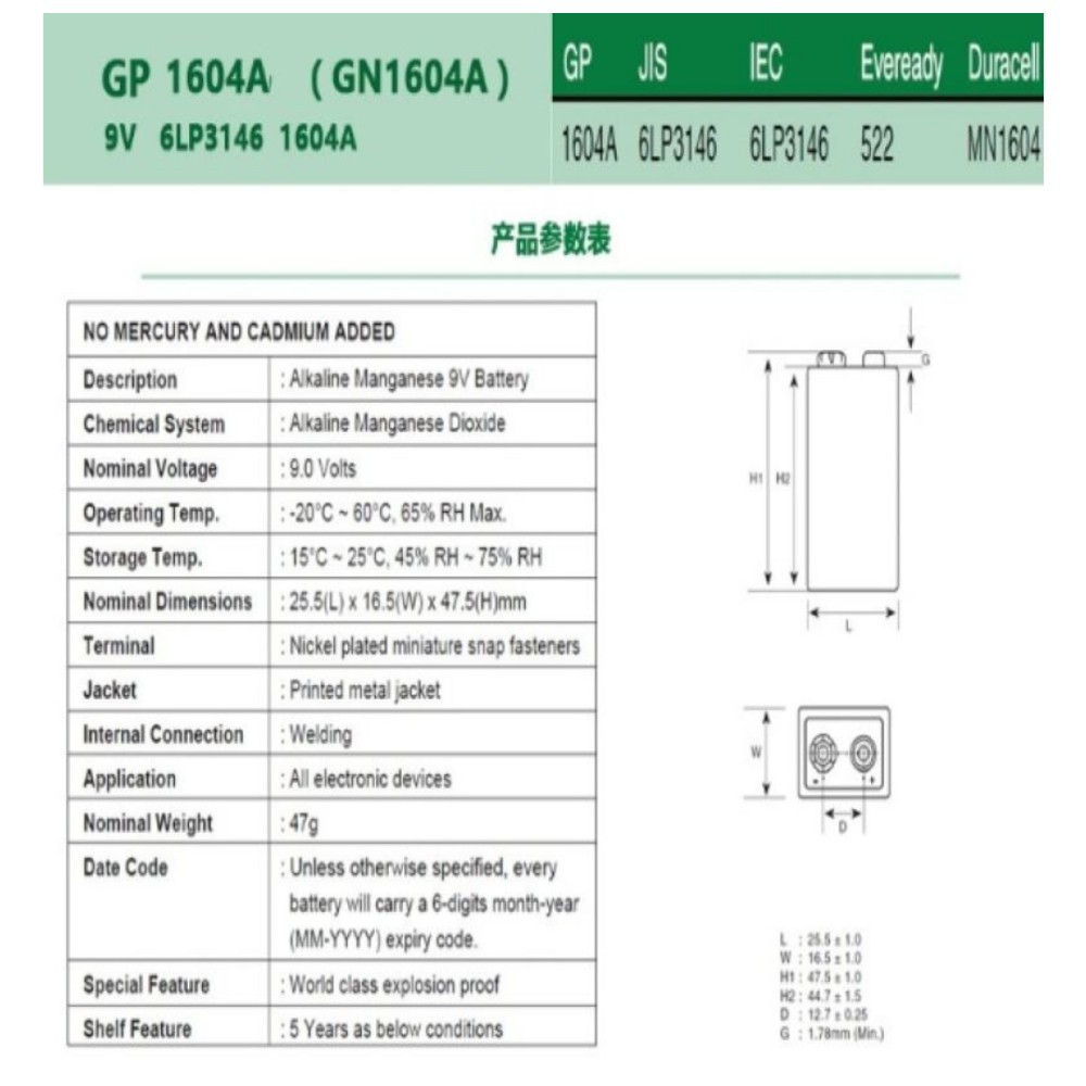 GP 1604A 9V PP3 6LF22 6LR61 MN1604 ALKALINE BATTERY MAXTAG BATTERY